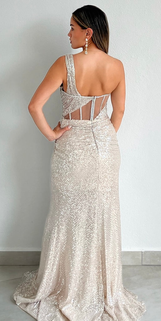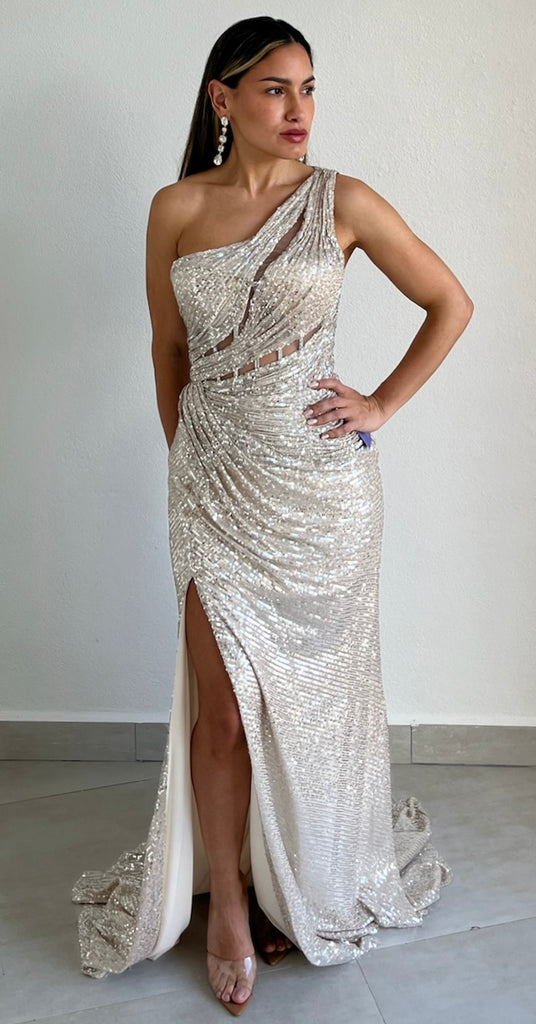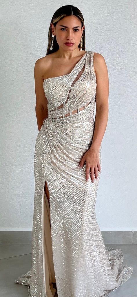 featuring One-Shoulder Top with See Through Corset at the Waist and Open Slit Long Skirt in a Silver Sequins Fabric.