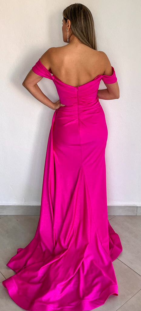 featuring Off-the shoulder Top, Draped & Fitted at the Top, Waist and Hips with Open Slit Skirt in a Shimmer Fuchsia Fabric.