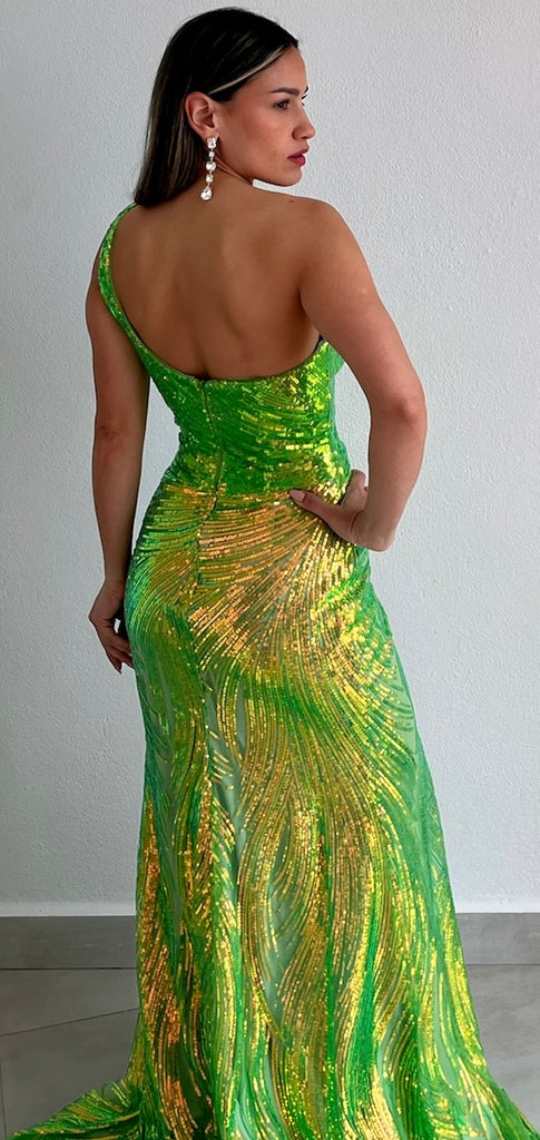 featuring One-Shoulder Top with See Through Mesh V-Neck, Fitted at the Waist and Open Slit Long Skirt in a Green Sequins Fabric.
