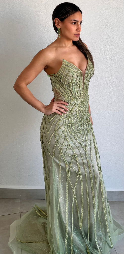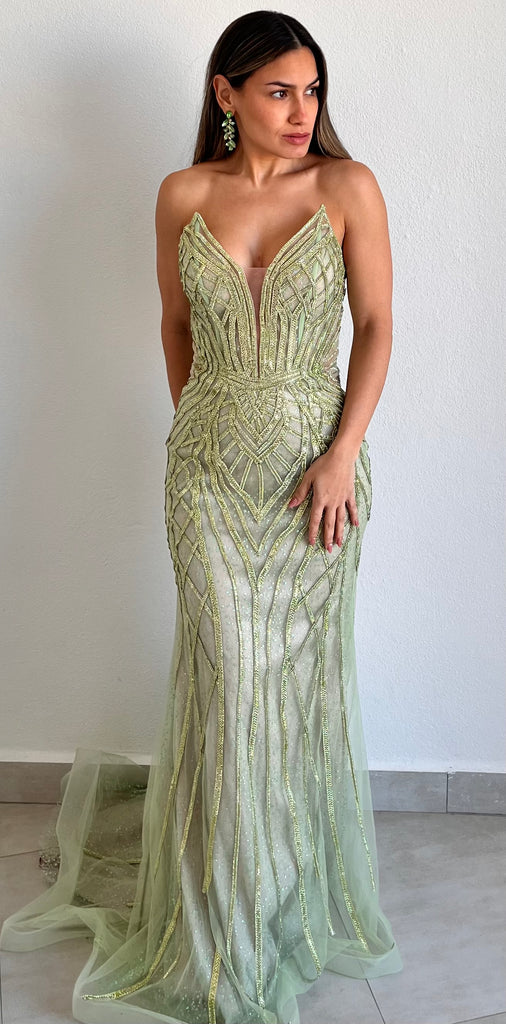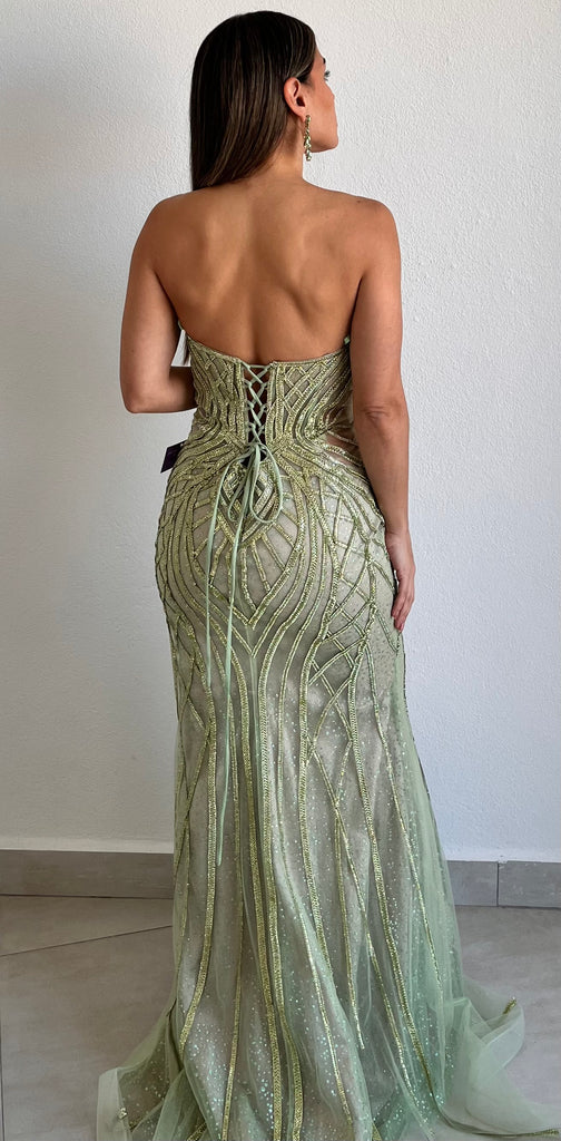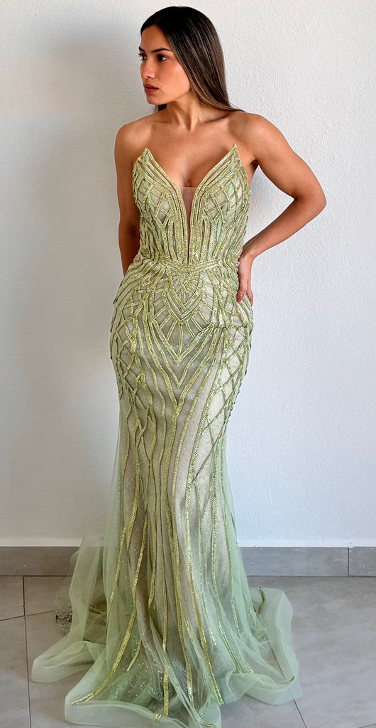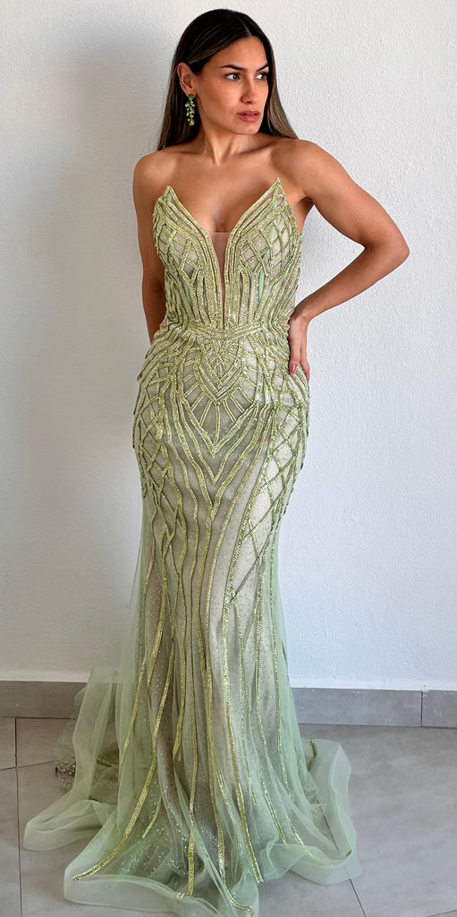 With a sleek fitted silhouette that hugs the body perfectly and a sophisticated strapless pointed neckline, this dress is sure to highlight your gorgeous figure. Complete with dazzling details like rhinestone embellishments and body contour design elements, you're sure to make a statement no matter where you go! Get ready for the night of your life with its sparkling layers of glitter tulle over a nude lining - perfect for the glam, sexy look you crave.