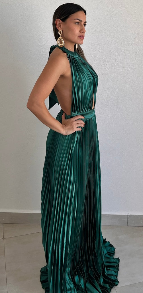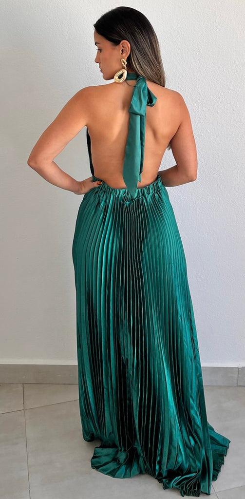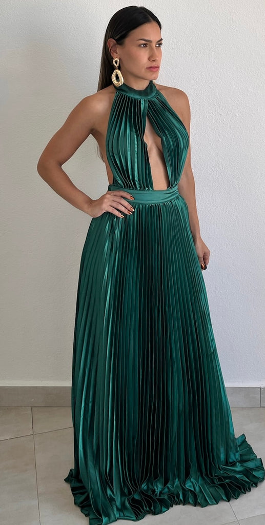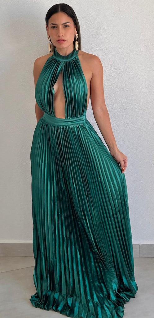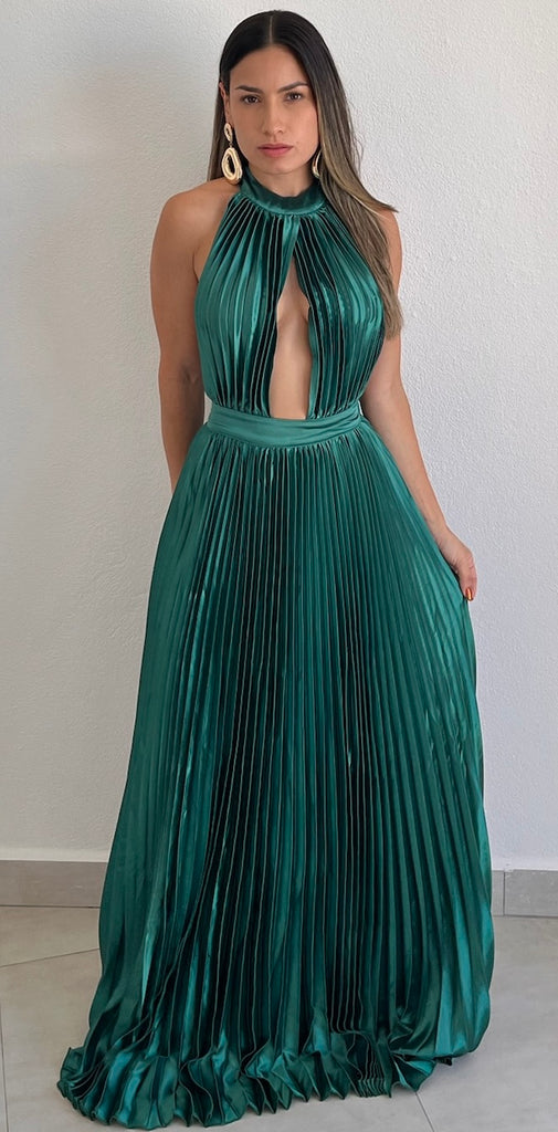 featuring Halter Top with Open at the Bust and Back, Fitted Waist and Flare Skirt in a Satin Pleated Fabric.