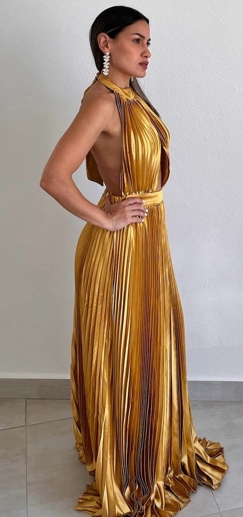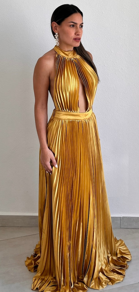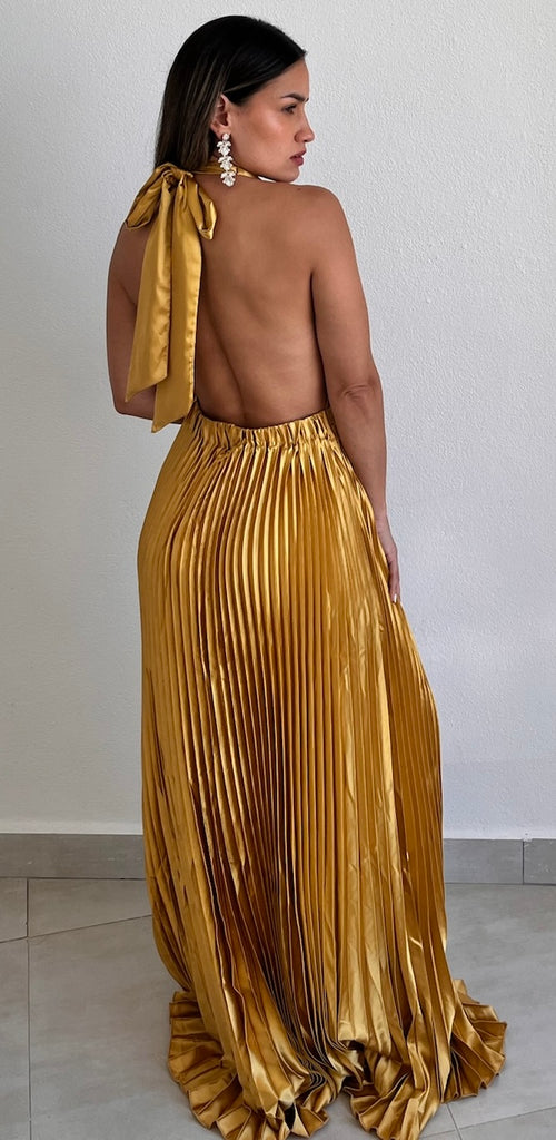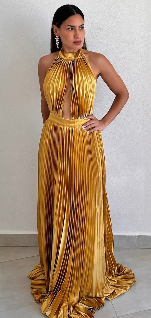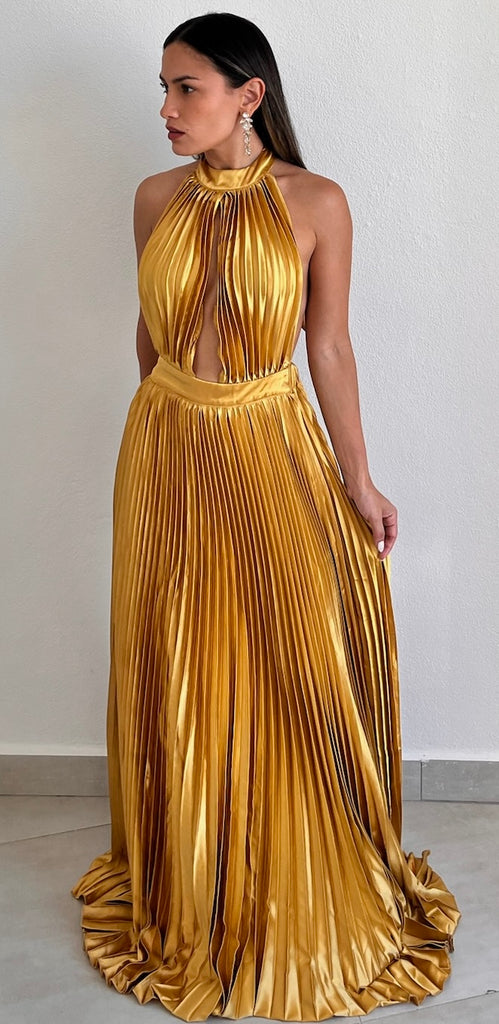 featuring Halter Top with Open at the Bust and Back, Fitted Waist and Flare Skirt in a Satin Pleated Fabric.