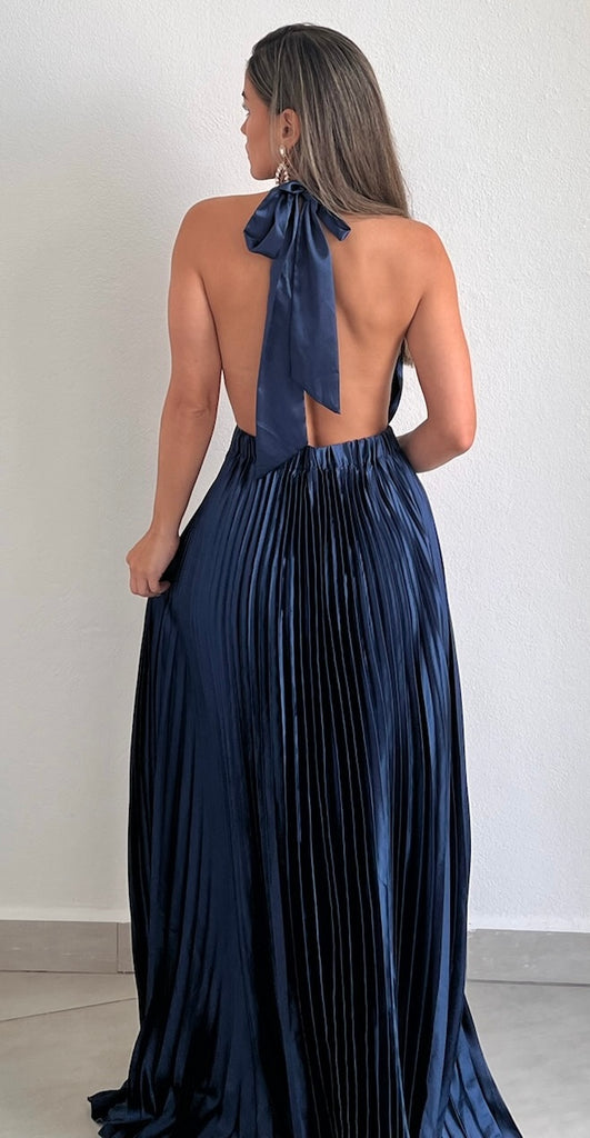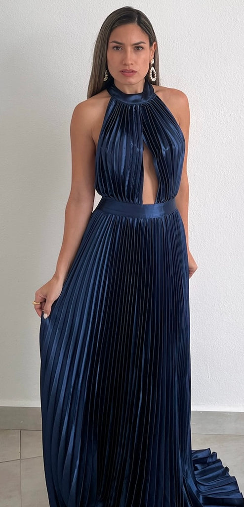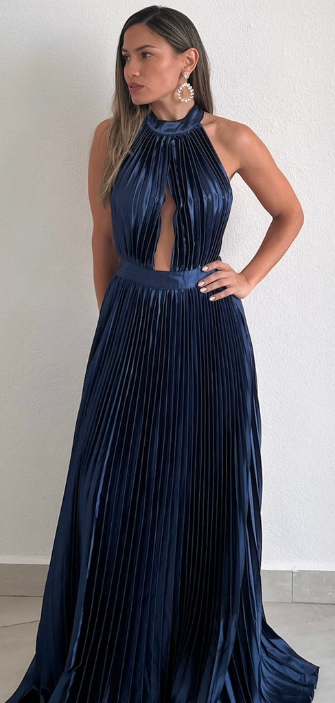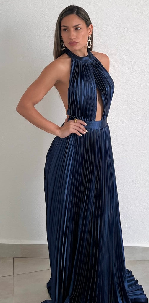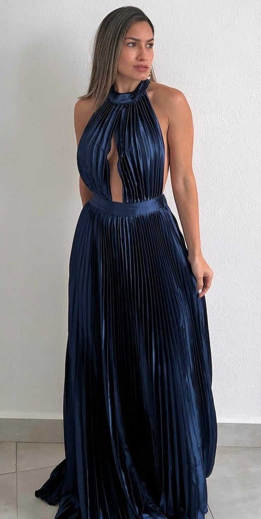 featuring Halter Top with Open at the Bust and Back, Fitted Waist and Flare Skirt in a Satin Pleated Fabric.