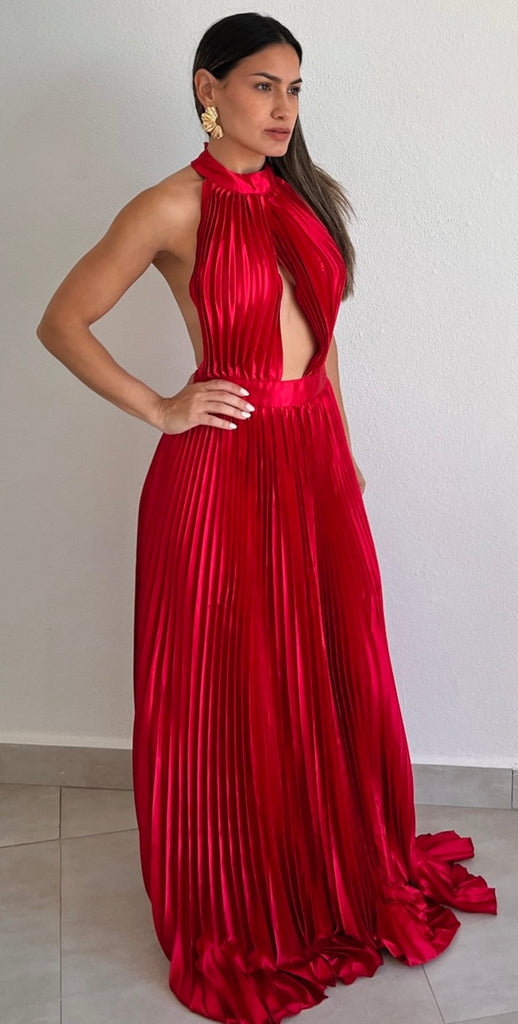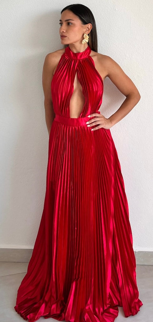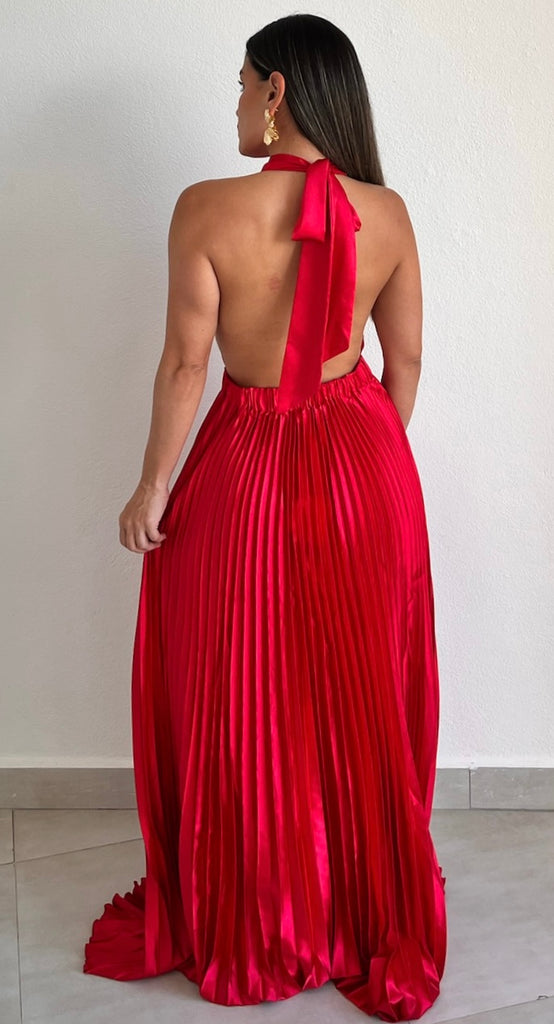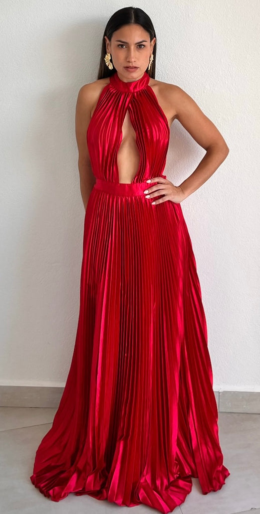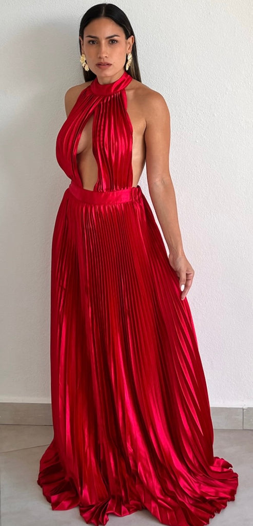 featuring Halter Top with Open at the Bust and Back, Fitted Waist and Flare Skirt in a Satin Pleated Fabric.