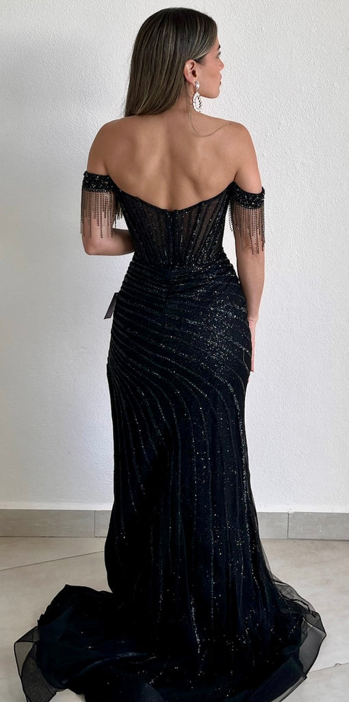 Step into the spotlight and steal the show in this stunning off the shoulder gown, it will take you to the stars with its dazzling and lavish design. From the boned sheer corset bodice to the linear crystal beaded motif, you will look absolutely gorgeous. The off the shoulder design is complemented by rhinestone fringe and a side leg slit to make sure you will be flaunting your curves in absolute confidence. Step out in style and let this sensational dress speak confidence as you strut down the street or dance the night away. You will be sure to make a lasting impression in this sexy and glamorous dress.