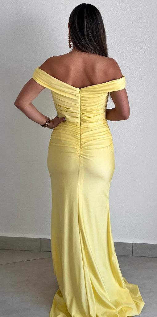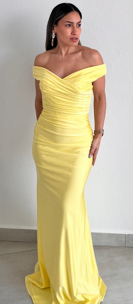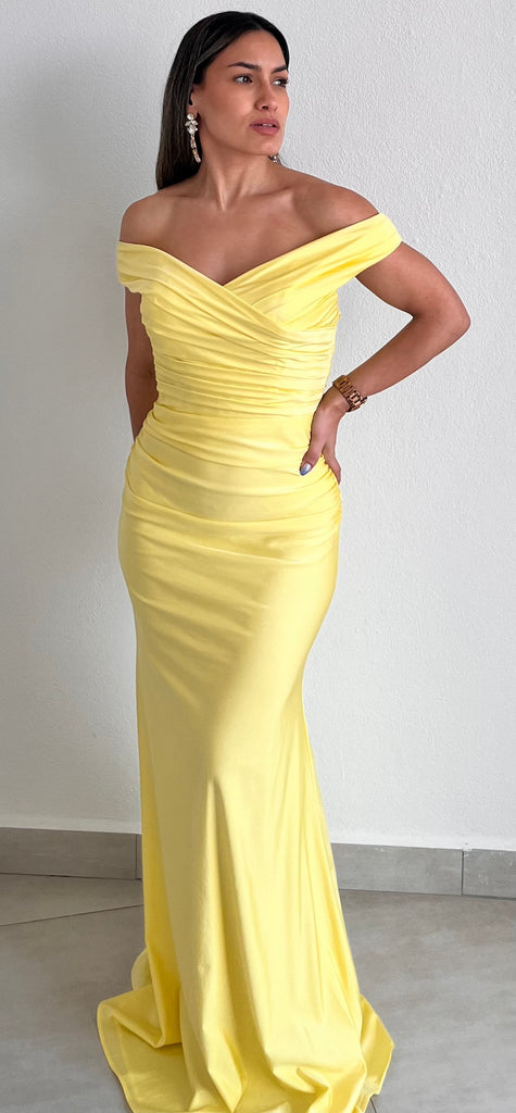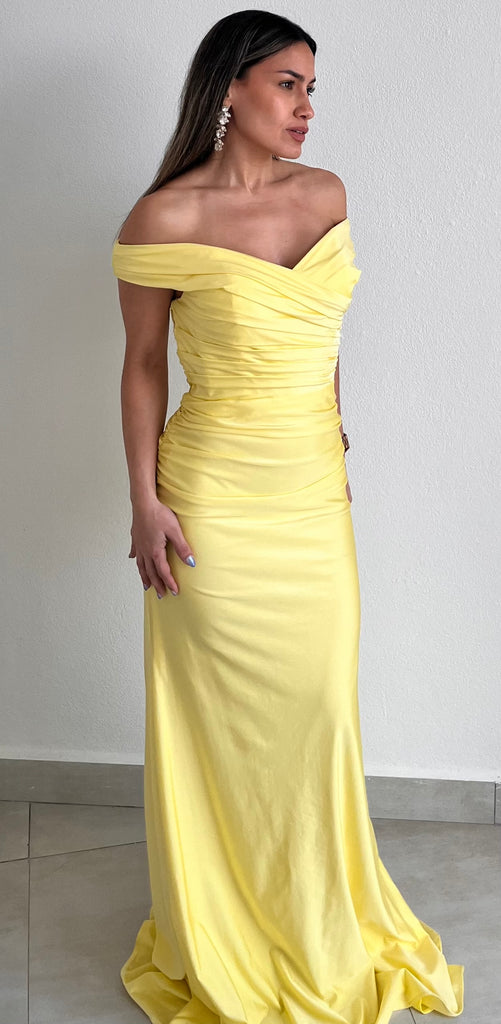 featuring Off-The-Shoulder Top, Draped & Fitted at the Top, Waist and Hips in a Spandex Satin Fabric.