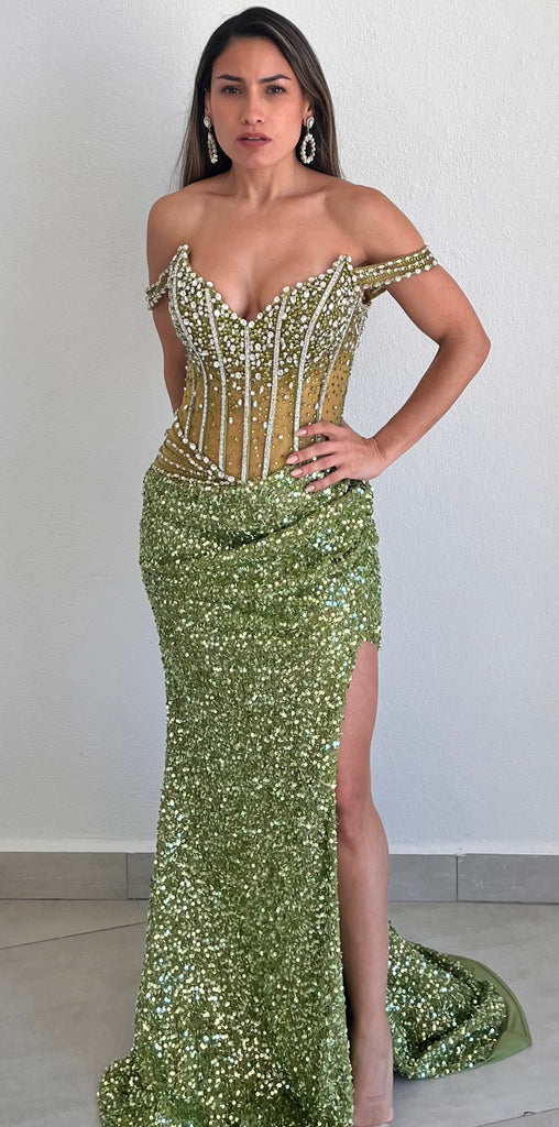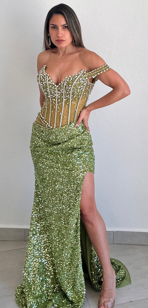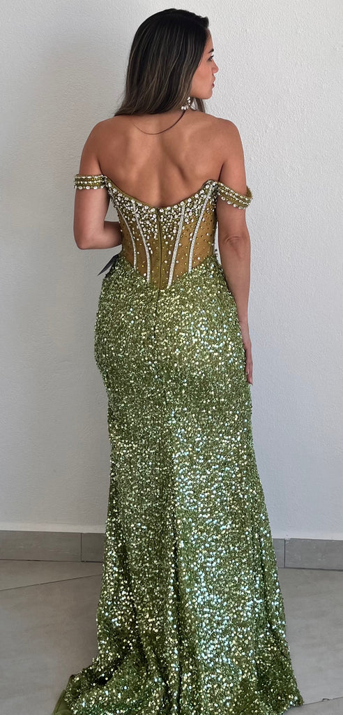 This dazzling fitted gown features an off-the-shoulder sweetheart neckline and a sheer bodice adorned with shimmering sequins and bead embellishments. The fit-and-flare silhouette hugs your curves beautifully, while the elegant leg slit adds a sultry touch. Designed for prom and formal events, this gown radiates confidence and sophistication with every step.