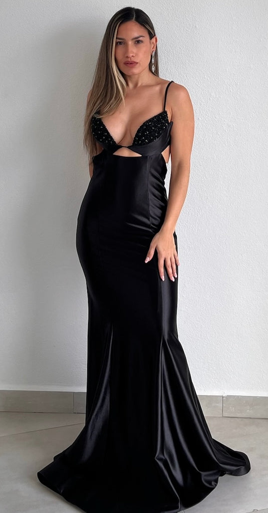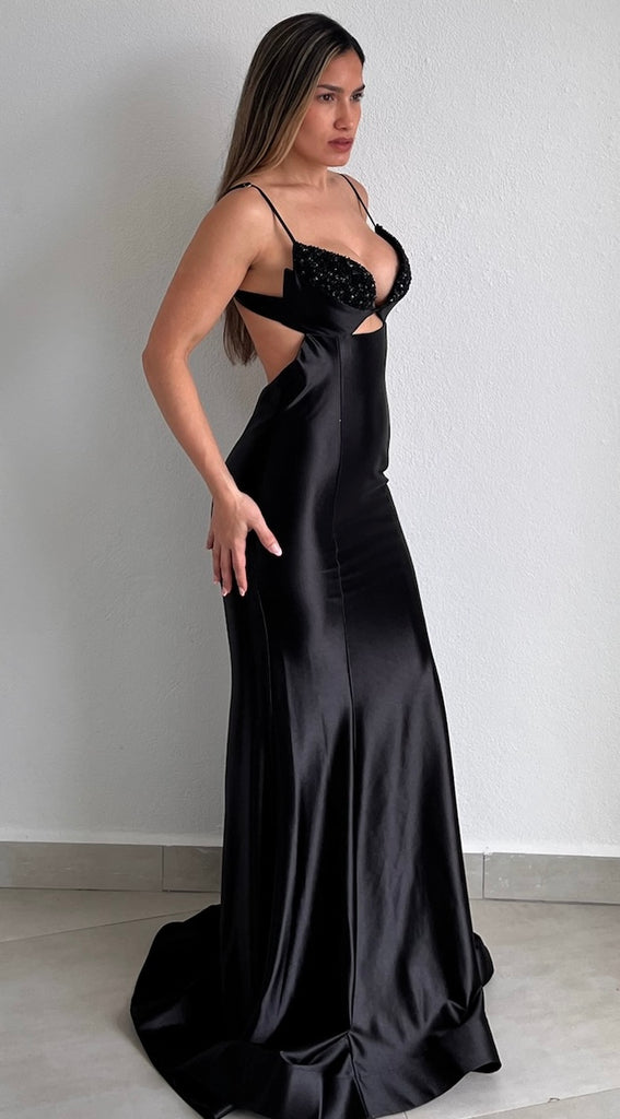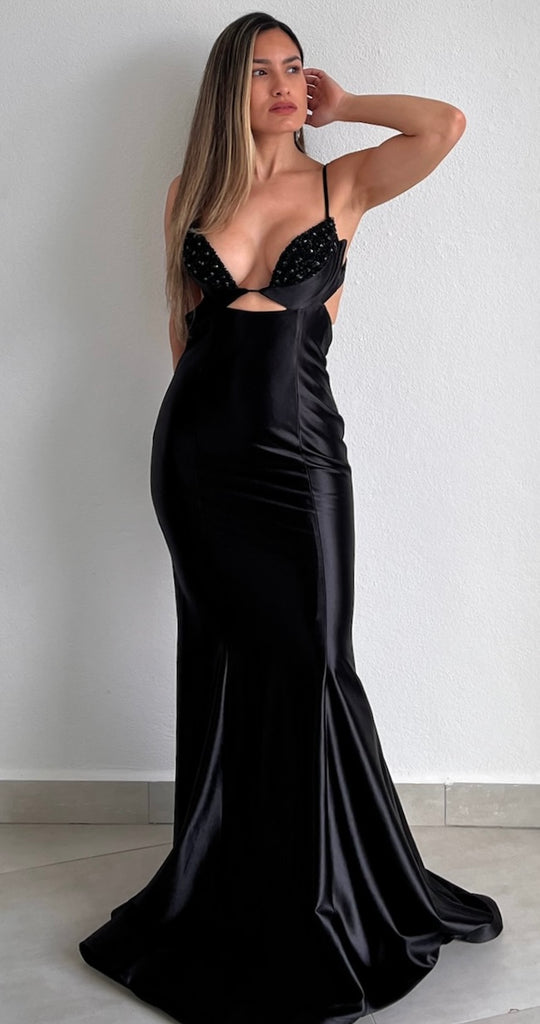 featuring Bra-Top with Beads with Cut-Out at the Center and Open Back with Fitted Mermaid Skirt in a Satin Black Fabric.