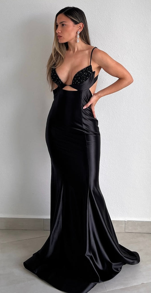 Gorgeous Backless Black Satin Gown