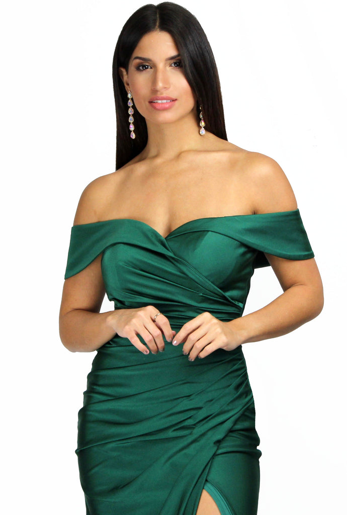 featuring Off-The-Shoulder Top with Draped Waist, Fitted Skirt with Open Slit in a Lovely and Soft Emerald Fabric.