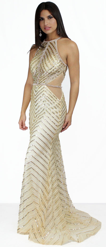 featuring Halter Top with See Thru Nude mesh Detail at the Sides of the Waist and Back; Rhinestones Detail at the Top, Arms, Waist, Center of the Bust and Back in a Nude & Gold Embroidery Fabric.