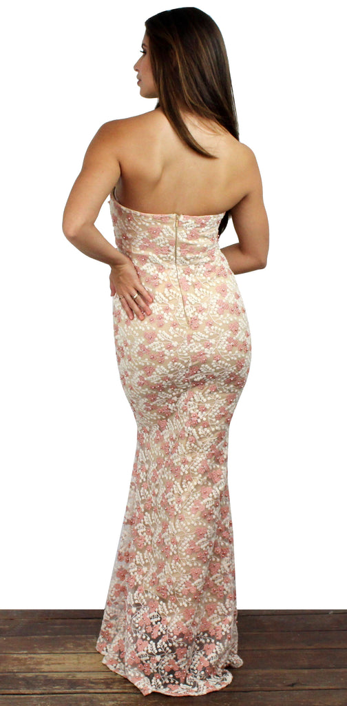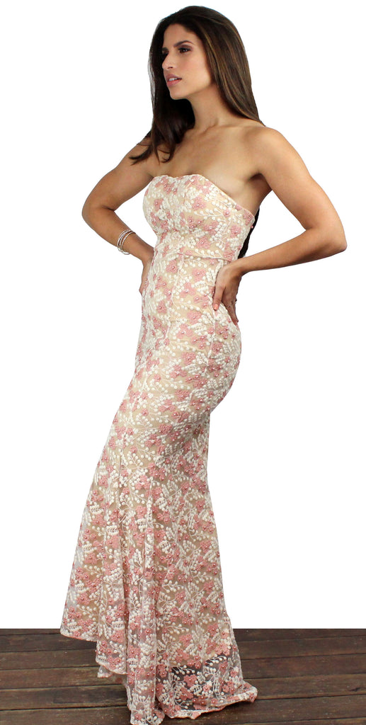 featuring Strapless Mermaid Cut Fitted Dress with High-Low Bottom in a White & Pink Crochet Fabric with Pearls Detail and Nude Lining