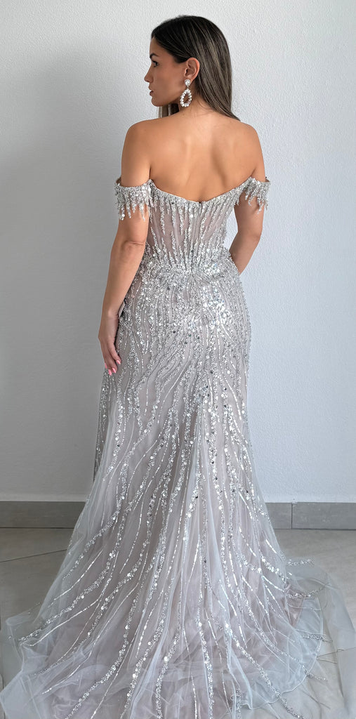 featuring Off The Shoulder Corset Top, See Through at the Waist and Fitted Skirt with Open Slit in a Sequins & Beads Silver Fabric.
