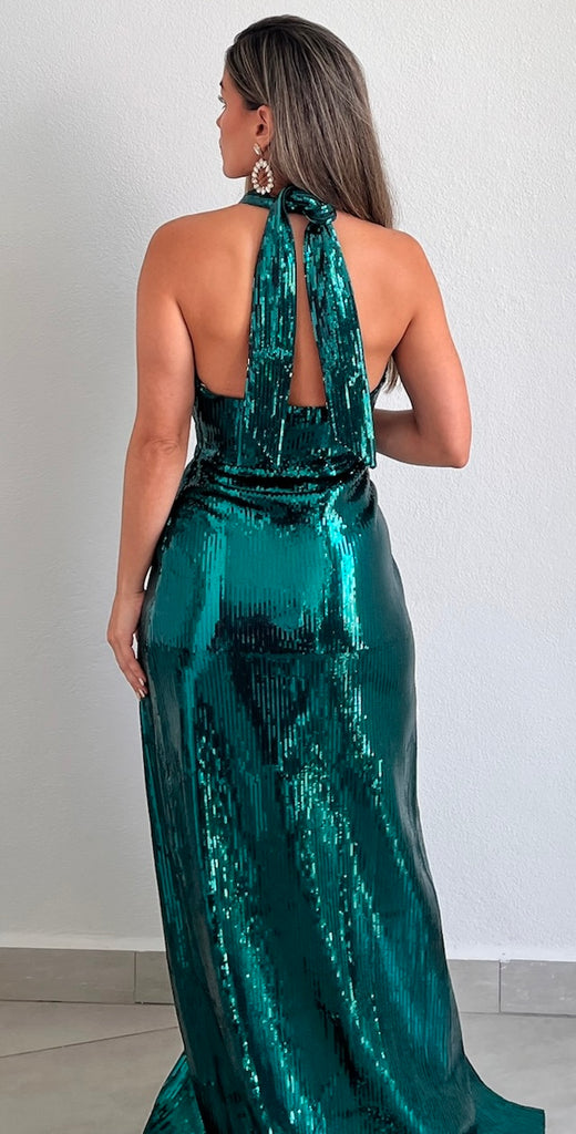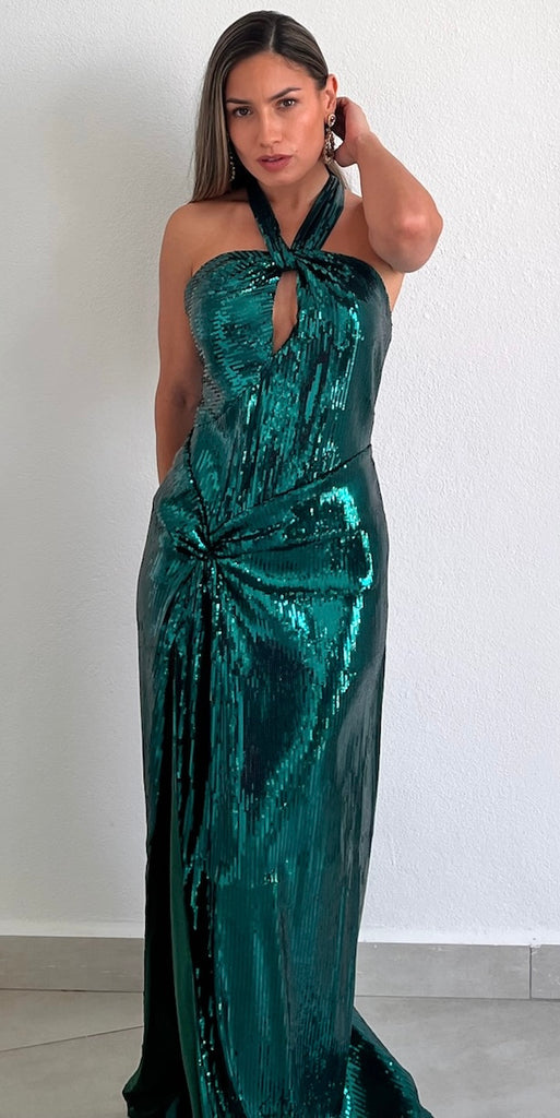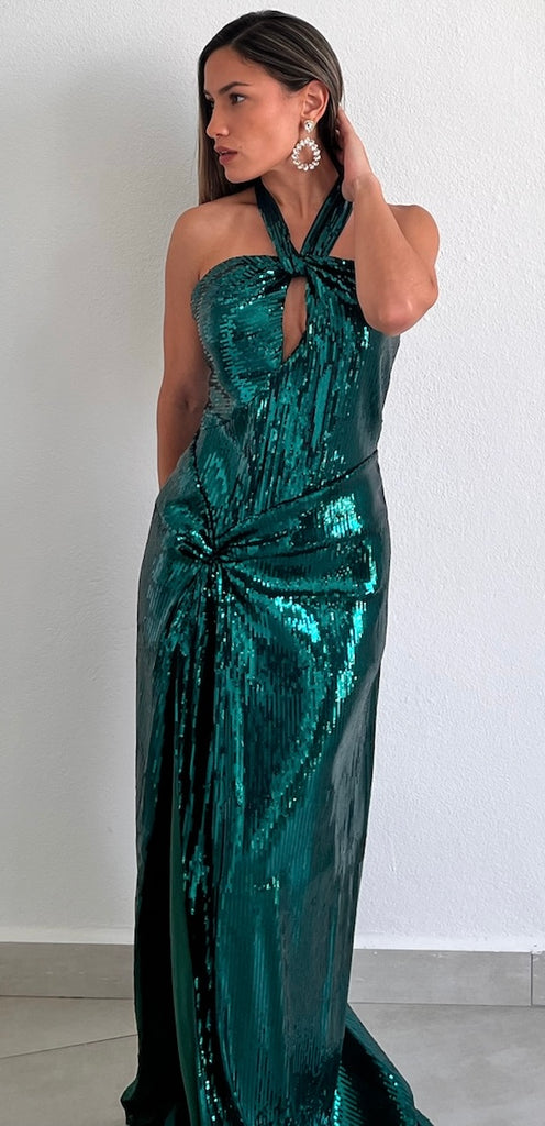 featuring Halter Top with Cut-Out Detail at the Center of the Bust. Twisted Detail at the Side of the Hips and Open Slit Long Skirt in a Dark Green Sequins Fabric.