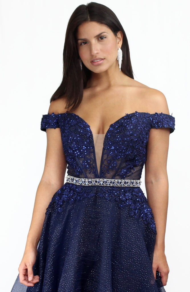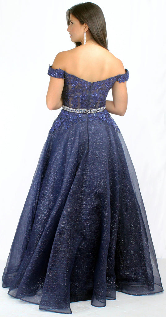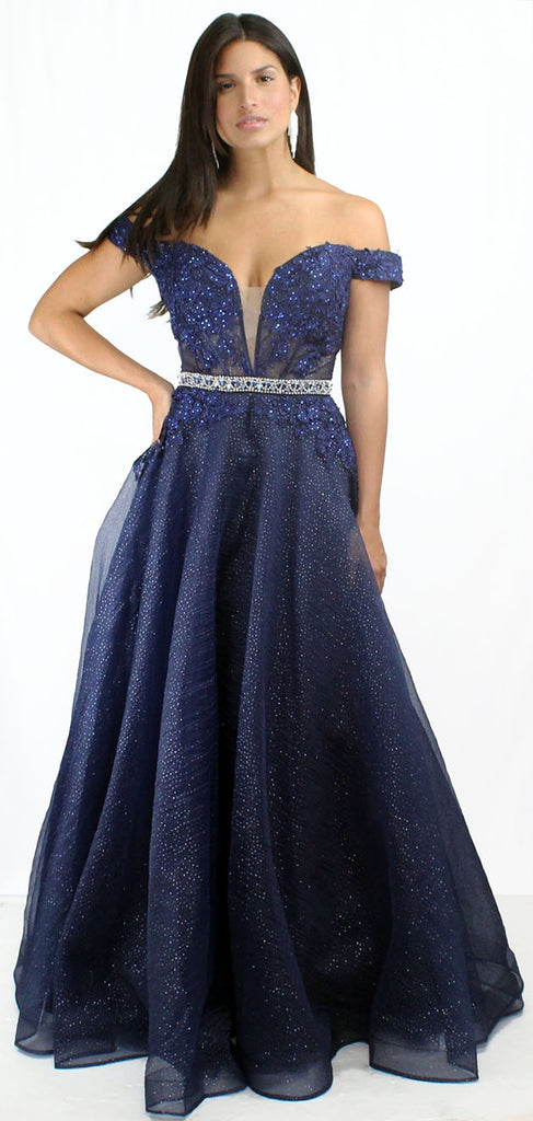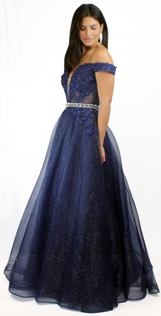 Fitted at the Waist with Silver Rhinestones Belt and Open Skirt in a Navy-Silver Shimmer Fabric Sheer.