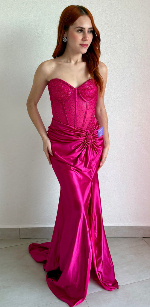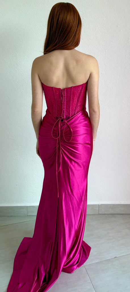 featuring Fitted gown dazzles with a strapless sweetheart neckline and a sheer rhinestone-adorned bodice, adding a captivating shimmer to its elegant design. Crafted from soft satin, the gathered waistline and leg slit create a graceful silhouette, complemented by the supportive lace-up corset back. Perfect for prom or formal events, this dress brings together sophistication and modern glamour.
