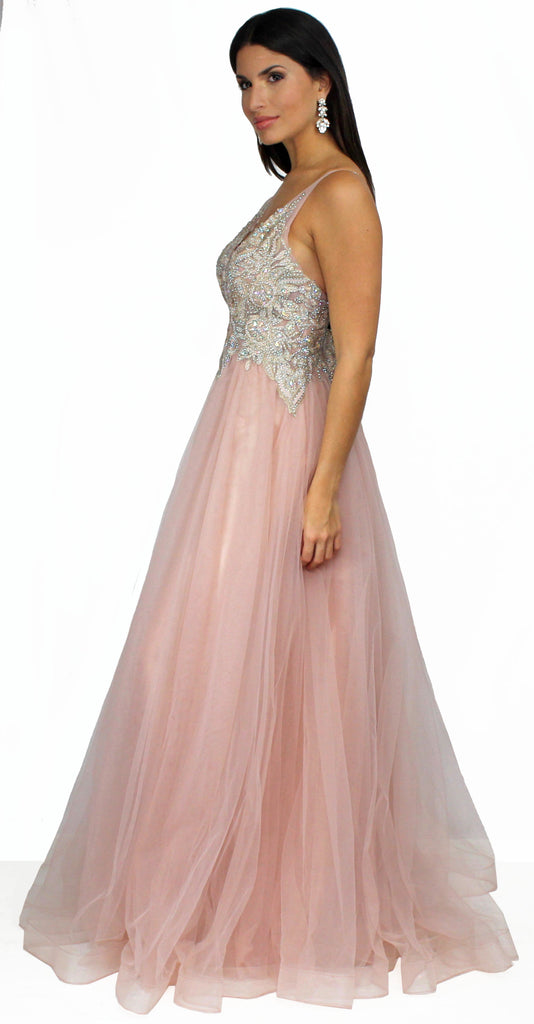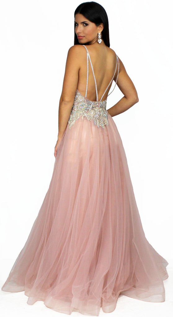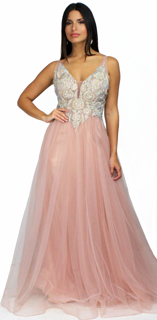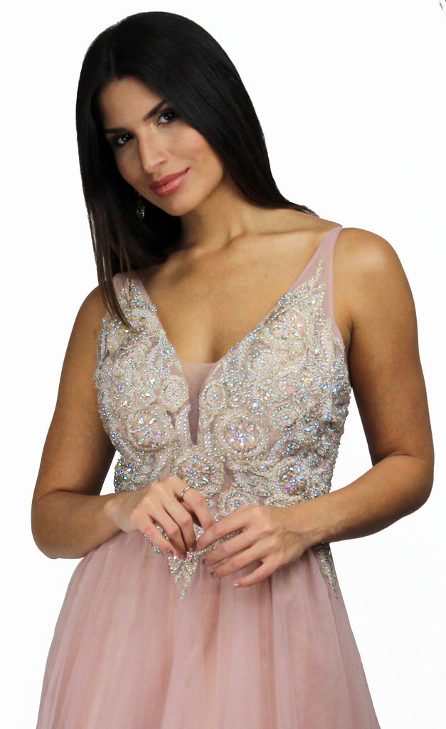 featuring V-Neck Top & Back with Holographic Stones Detail and Flare Skirt in a Delicate Mauve Mesh Fabric.