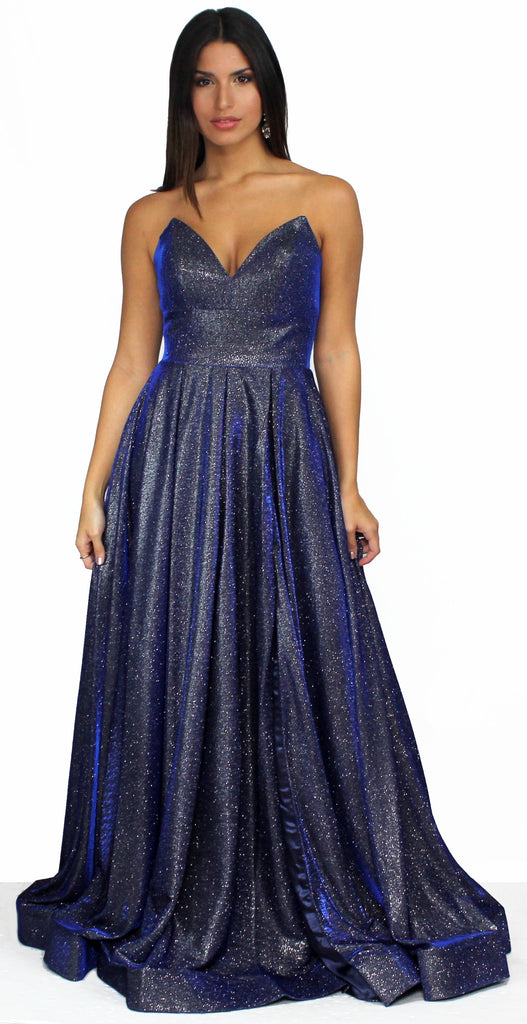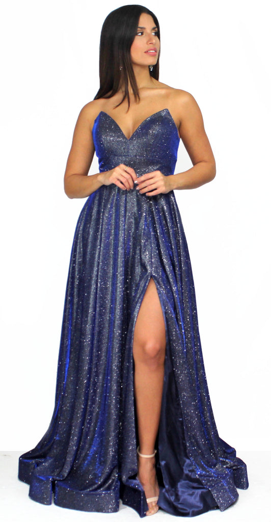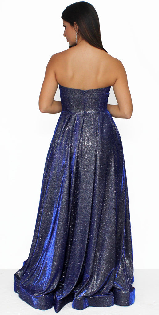 featuring Strapless Heart Cut at the Bust, Fitted to the Waist and Flare Skirt with Slit Detail in a Shimmer Dark Blue Fabric.