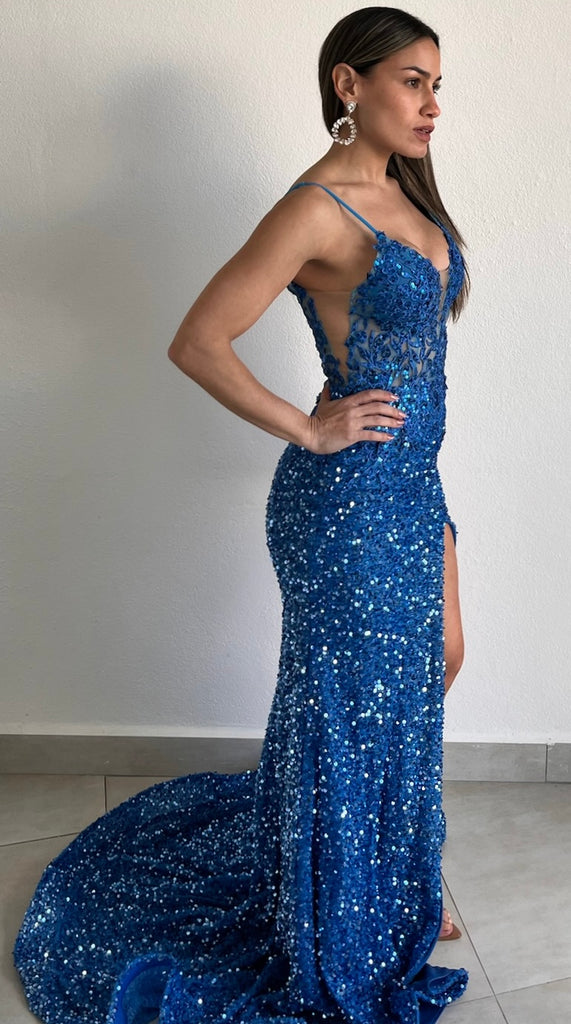 featuring Spaghetti Straps V-Neck Top with Lace Detail at the Top & Waist and Sequins Fitted Long Skirt with Open Slit.