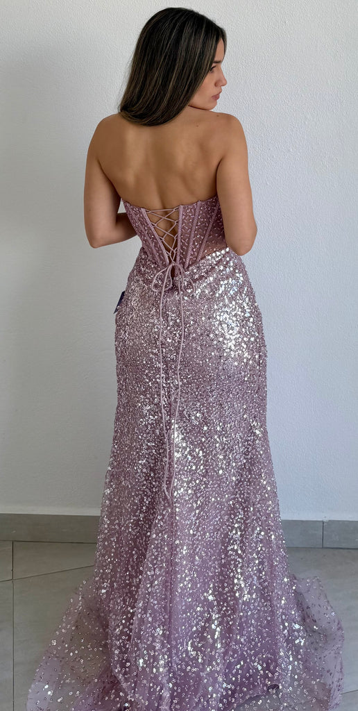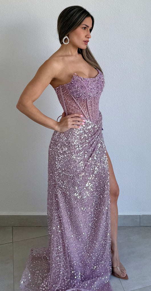 featuring Strapless See Through Beaded Corset with Draped Skirt at the Waist with Open Slit in a Sequins, Beads and Glitter Mauve Fabric.