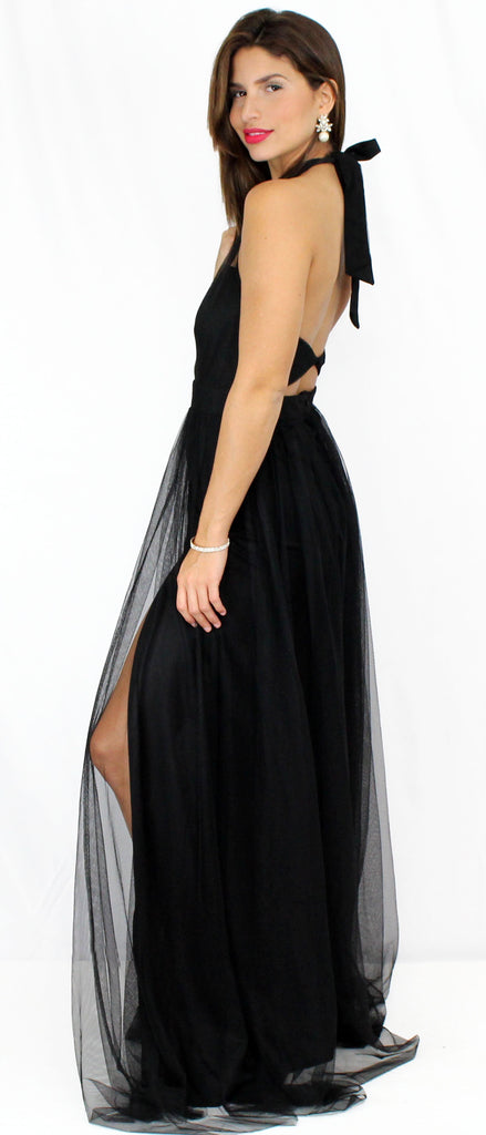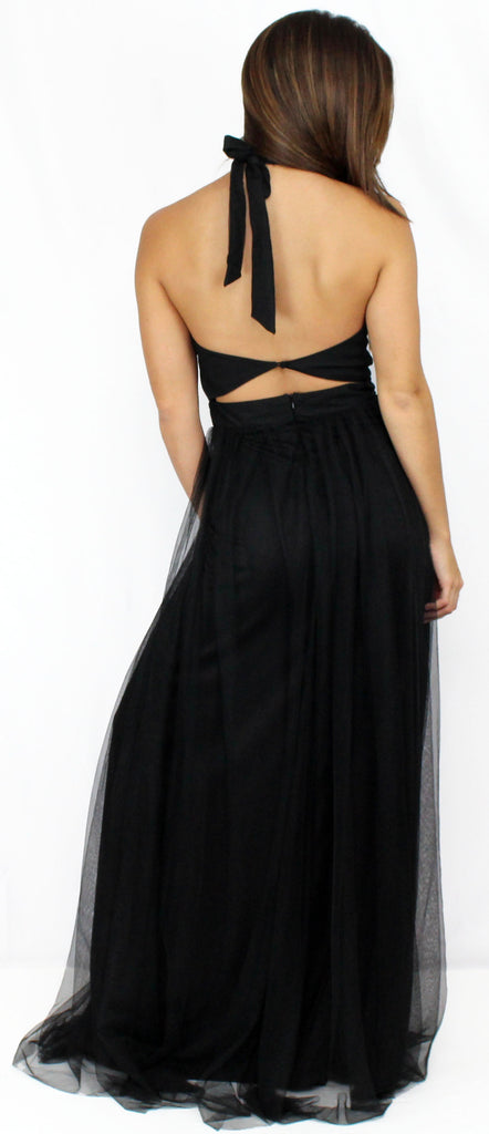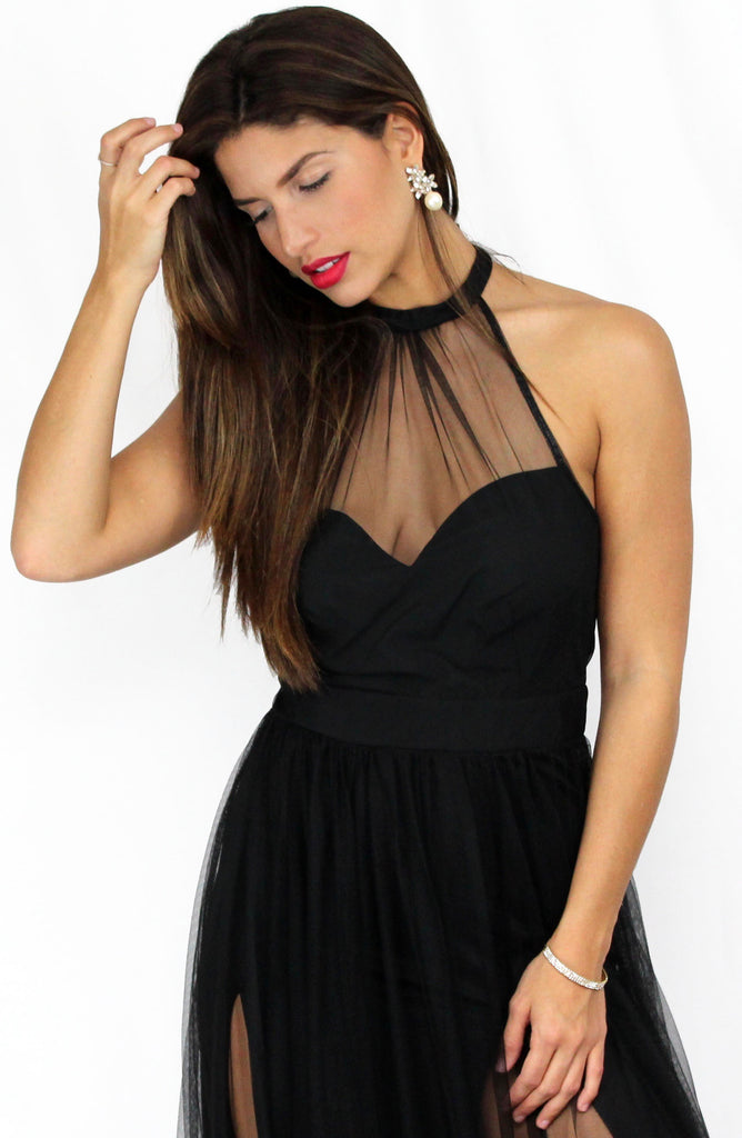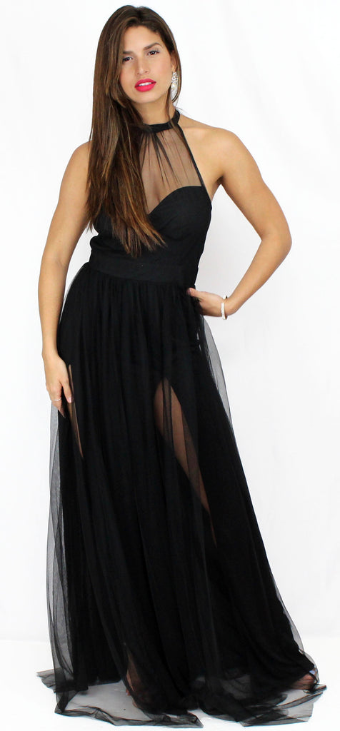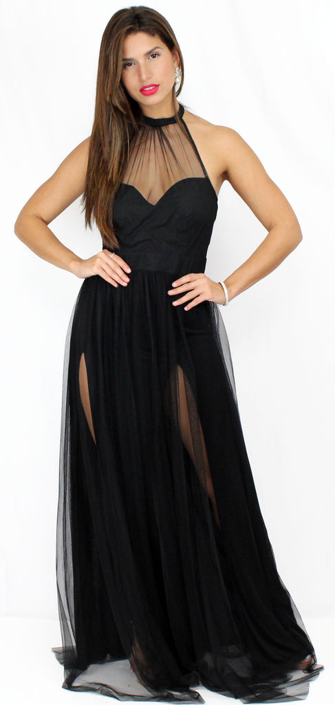 featuring See Thru Mesh Halter Top with Heart Cut Wine Lining, Fitted Top & Waist. Open Skirt with Slit Both Legs.