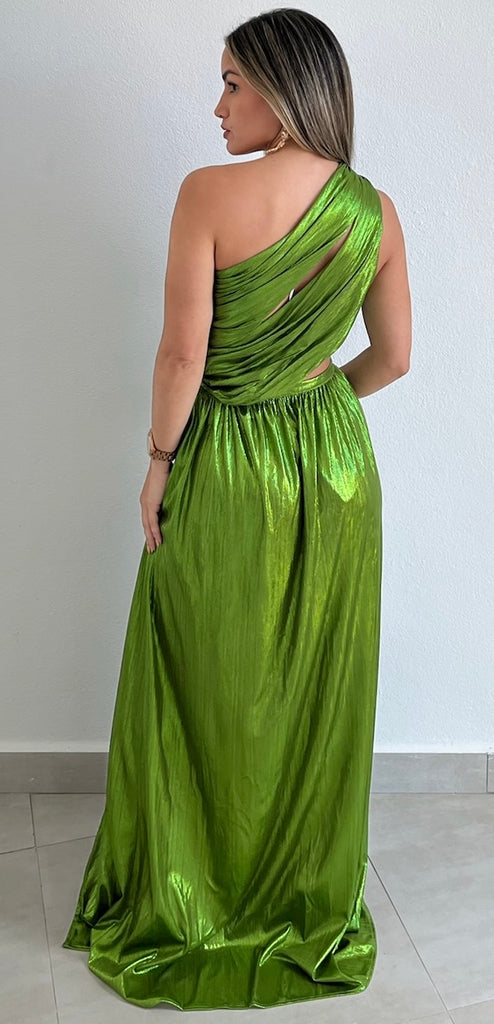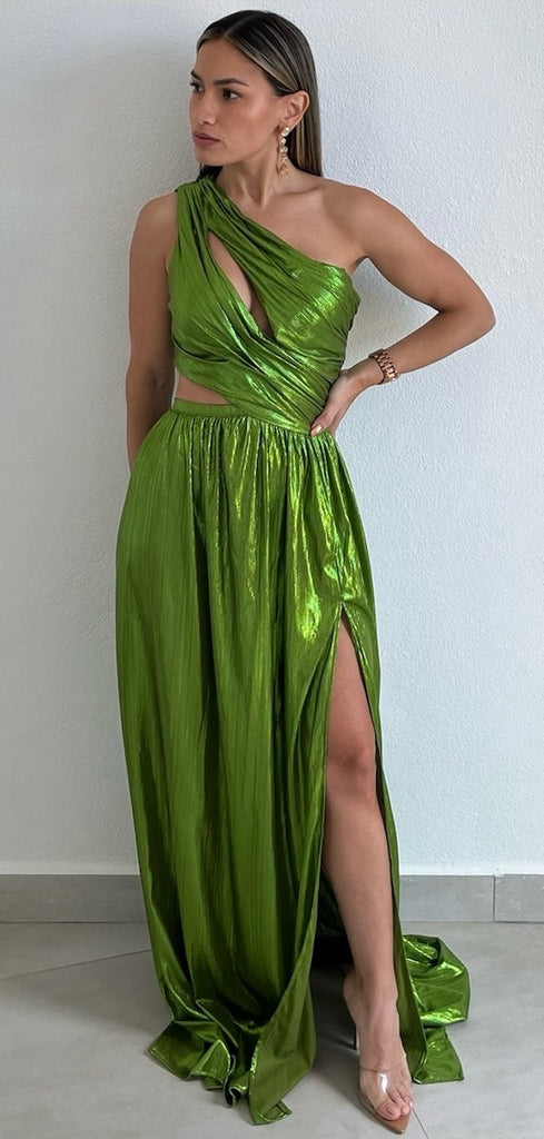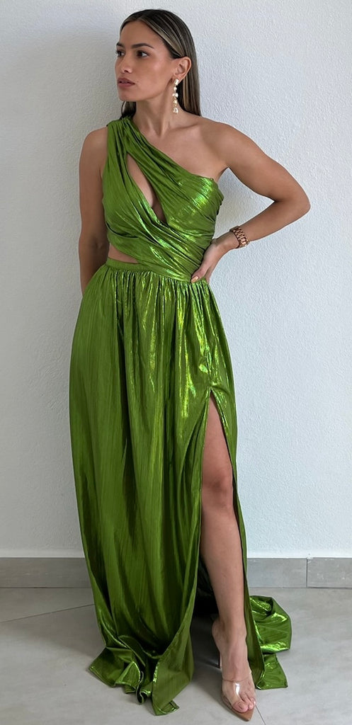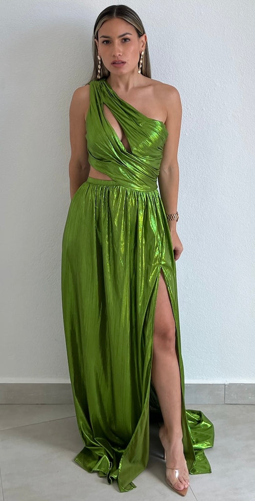 featuring One-Shoulder Draped Top, Cut-Out Detail at the Waist and Flare Skirt with Slit Detail in a Green Metallic Fabric.