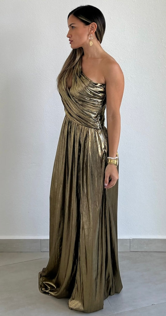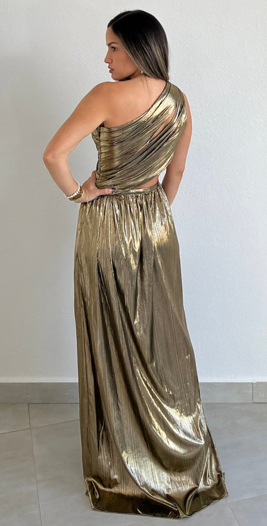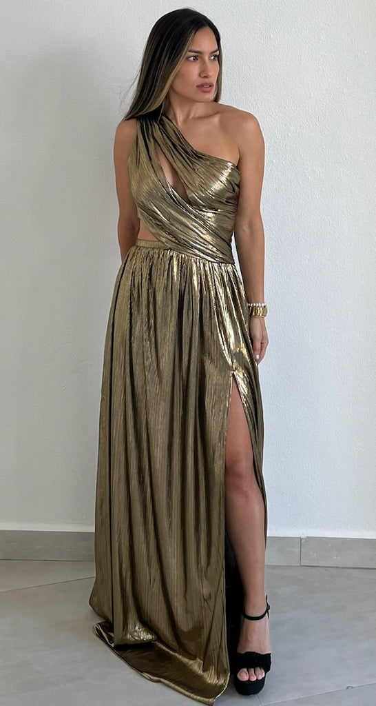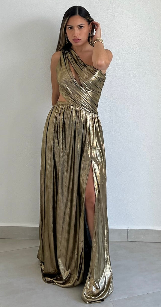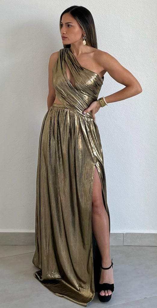 featuring One-Shoulder Draped Top, Cut-Out Detail at the Waist and Flare Skirt with Slit Detail in a Gold Metallic Fabric.