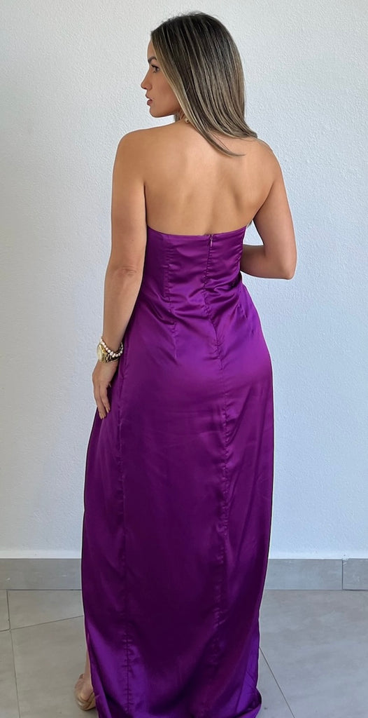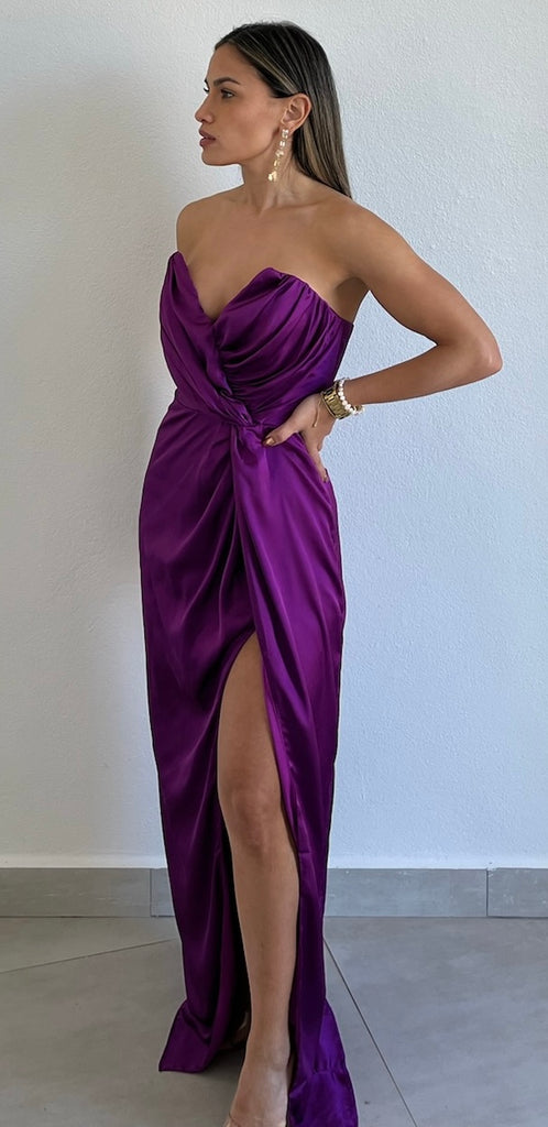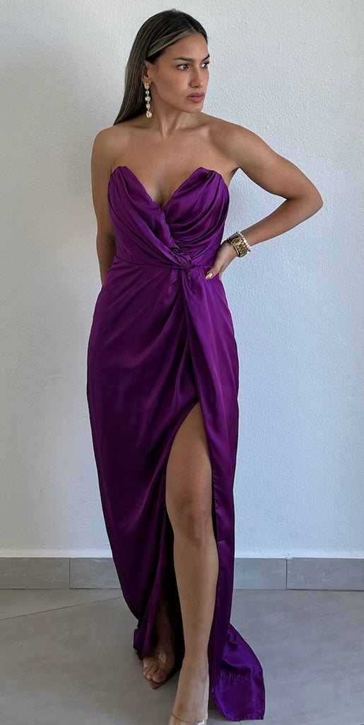featuring Strapless Top with Heart Cut and Draped at the Bust, Twisted Detail at the Waist and Open Slit Skirt in a Satin Fabric.