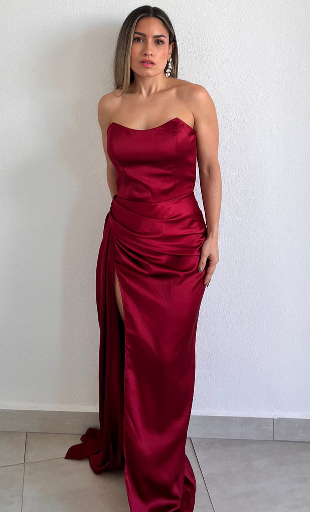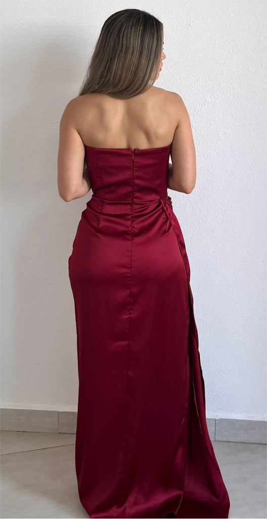 featuring Strapless Top, Fitted at the Top & Waist with Draped Detail at the Hips and Open Slit in a Satin Burgundy Fabric.