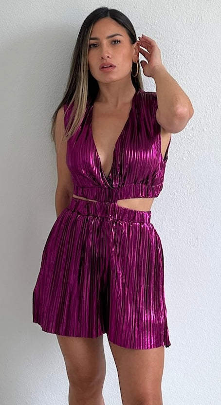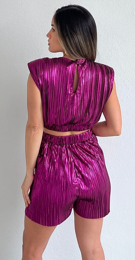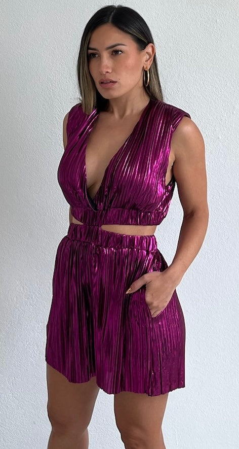 featuring Sleeveless V-Neck Top with Shoulder Pads, Cut-Out at the Waist and Flare Shorts in a Pleated Metallic Fabric.