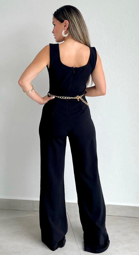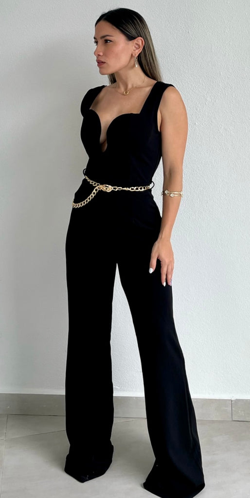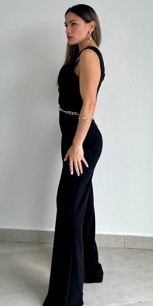 featuring Deep V-Neck Top with Breast Cups, Fitted at the Waist and Flare Pants with Gold Chain Belt in a Soft & Spandex Black Fabric.