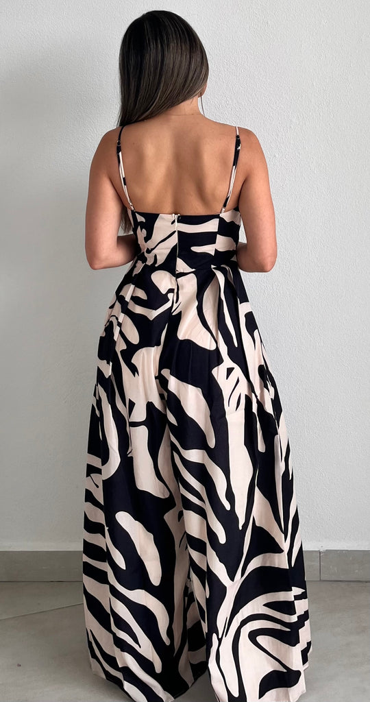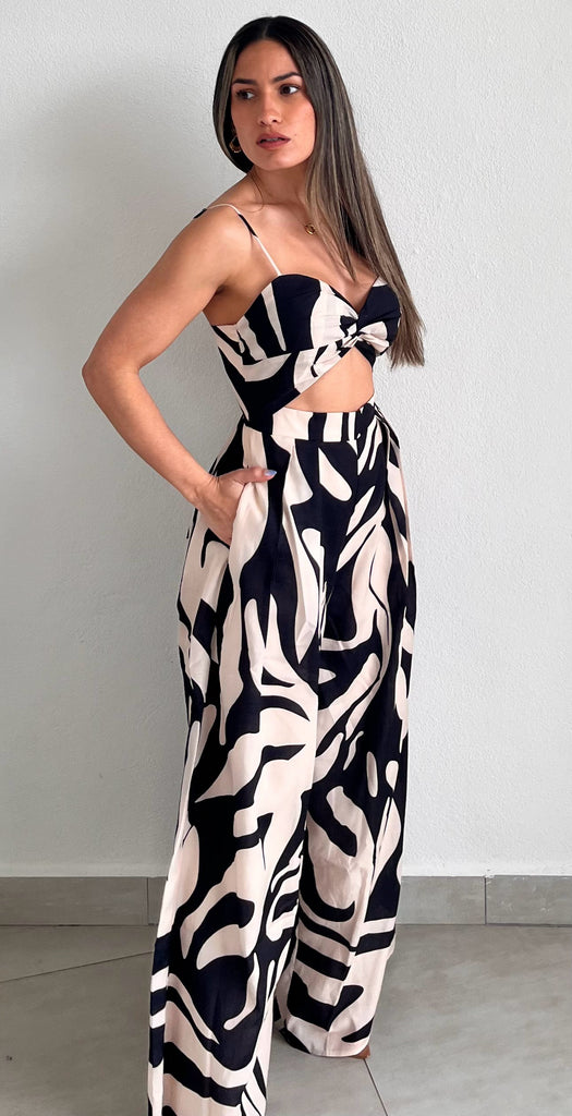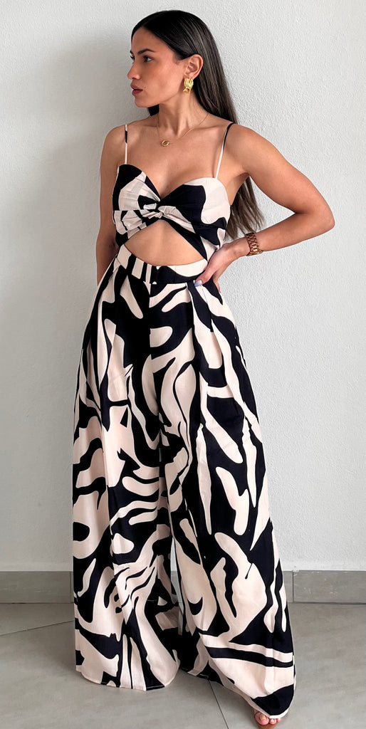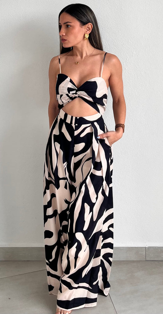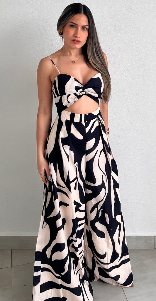 featuring Spaguetti Straps Fitted Top with Cut-Out at the Waist and Palazzo Pants with Pockets in a Cotton Abstract Fabric.