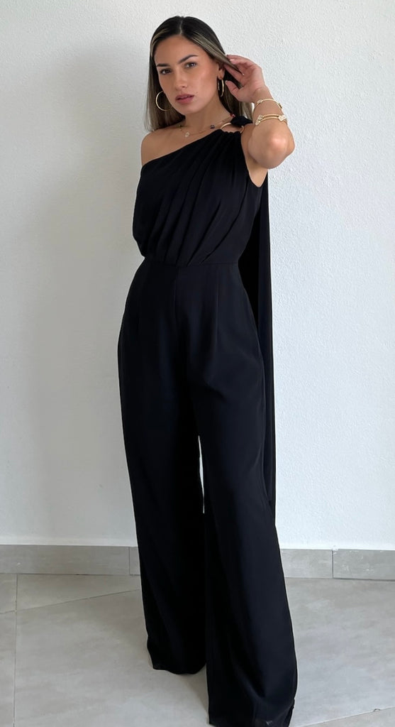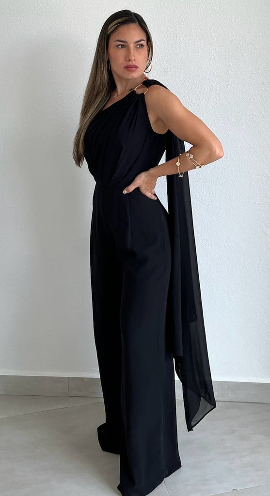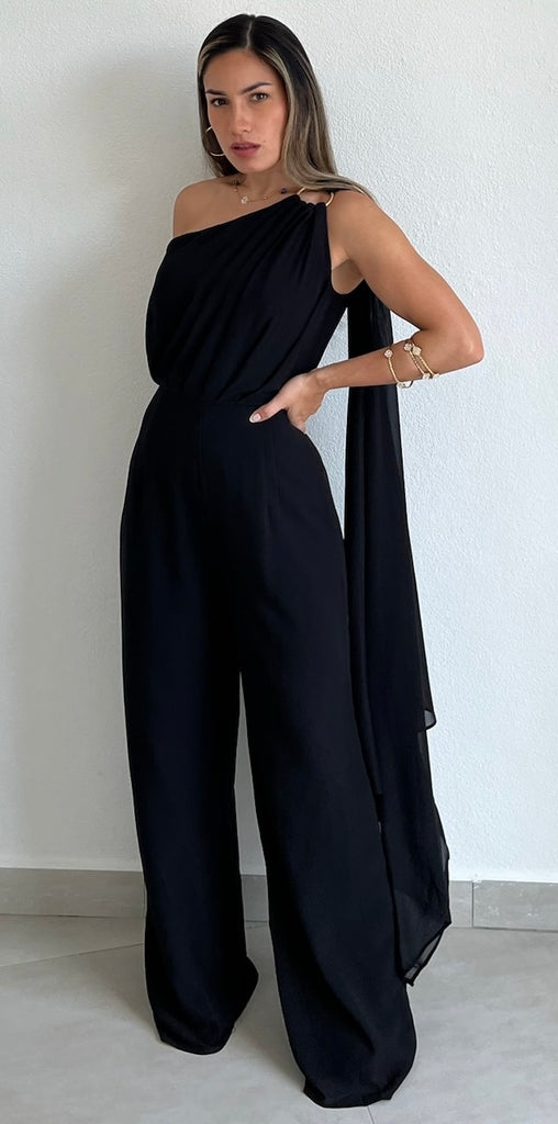 Elegant One-Shoulder Black Chiffon Jumpsuit