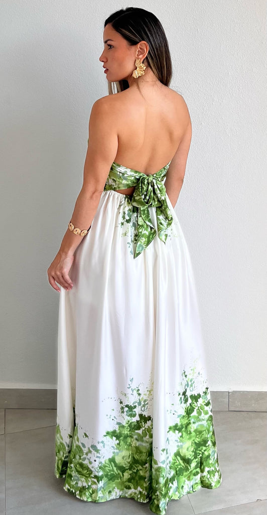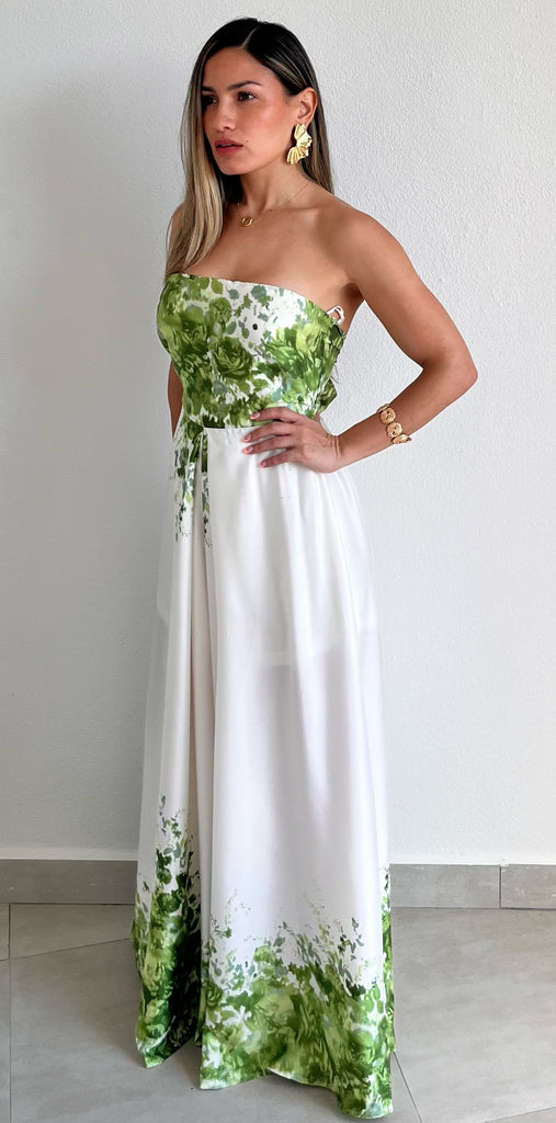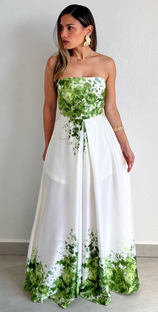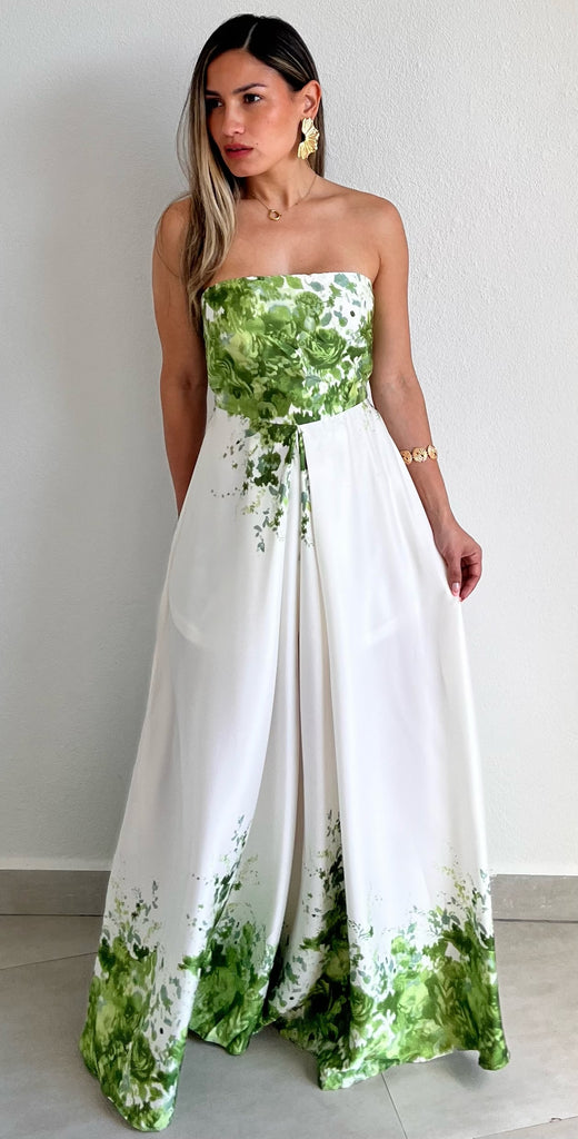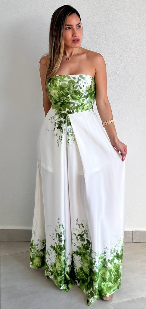 featuring Strapless Top, Adjustable at the Back with a Knot, Open Back Waist and Flare Long Pants in a Soft Satin Fabric with Green Print