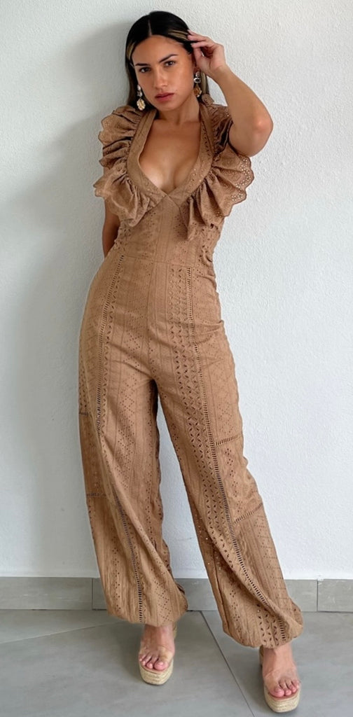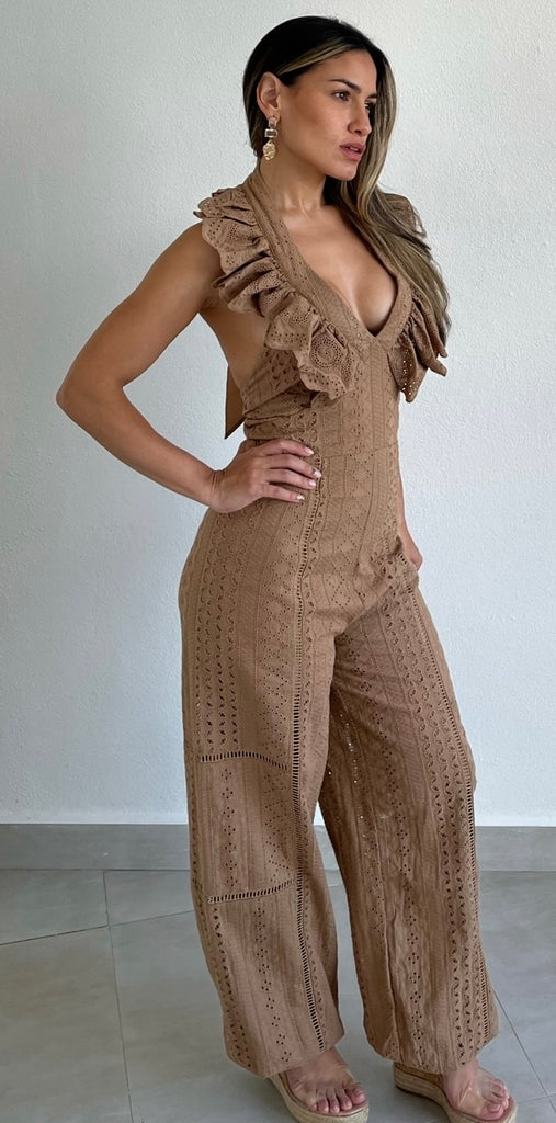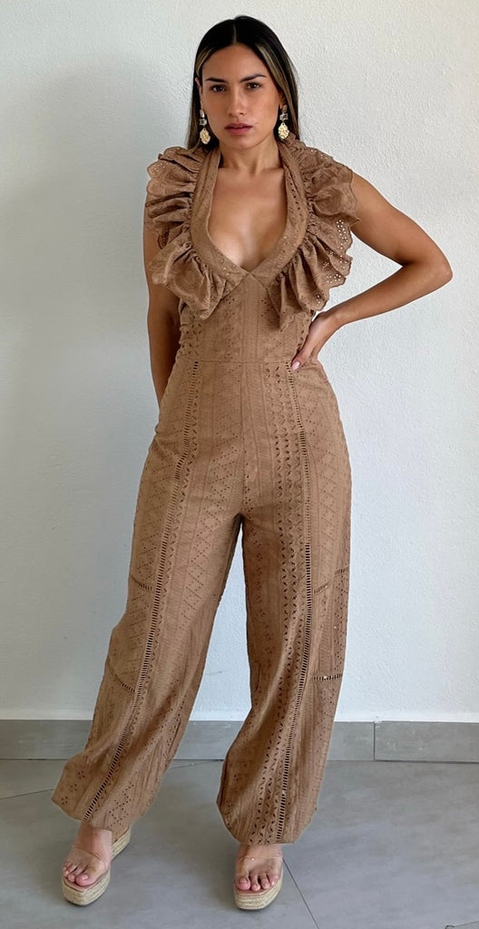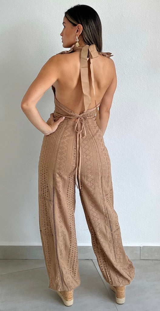 featuring Halter Ruffled Top with Crossed Straps at the Back and Flare Pants in a Delicate Eyelet Fabric.