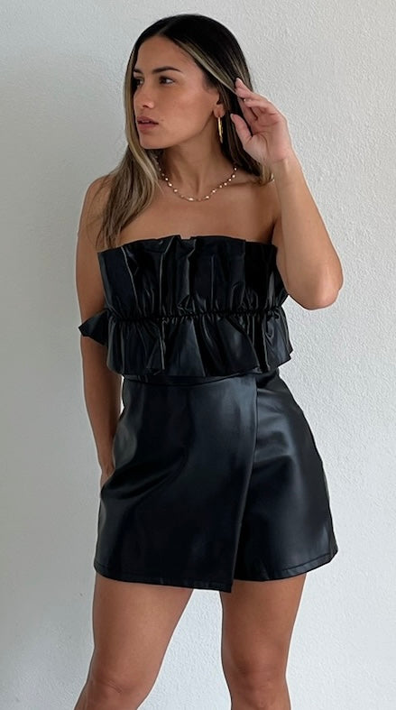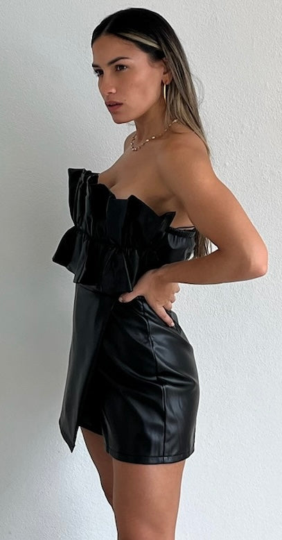 featuring Strapless Ruffle Top with Over Layer Skort Bottom in a Black Vegan Leather Fabric.
