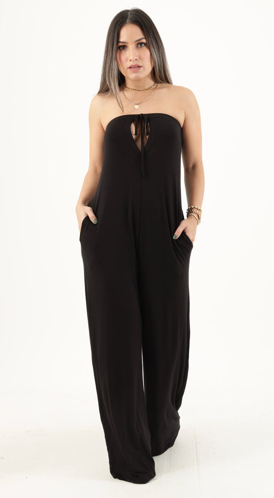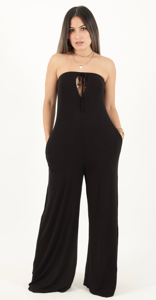 featuring Strapless Top with Cut-Out at the Bust and Flare Silhouette with Pockets in Black Knit Jumpsuit.