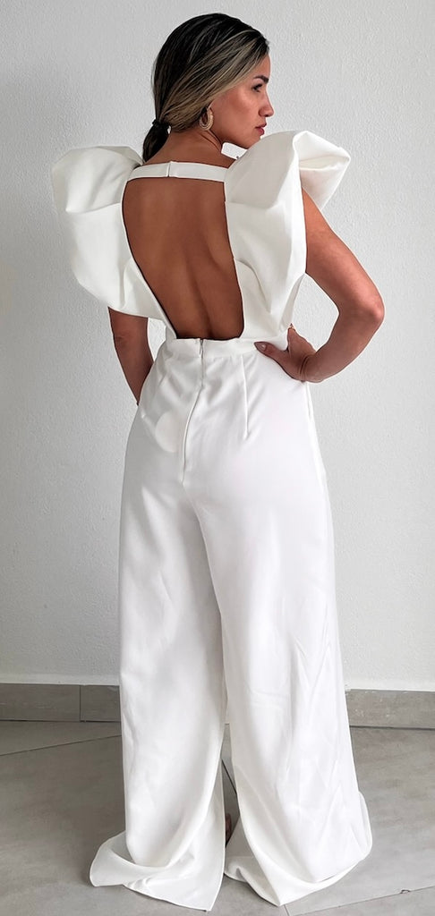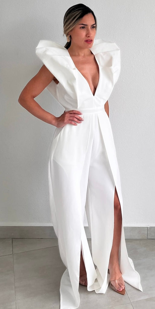 featuring Deep V-Neck Top with Open Back & Puffy Arms Detail, Fitted at the Waist and Flare Pants with Open Front Slits in a White Fabric.