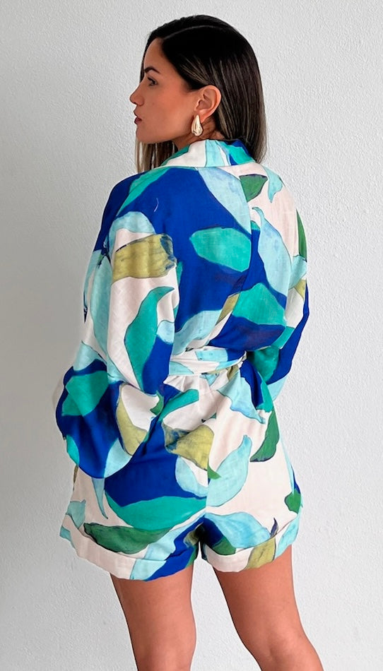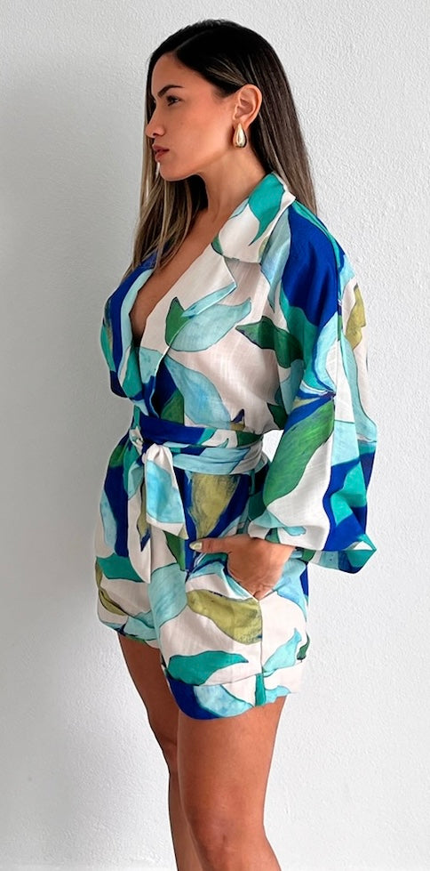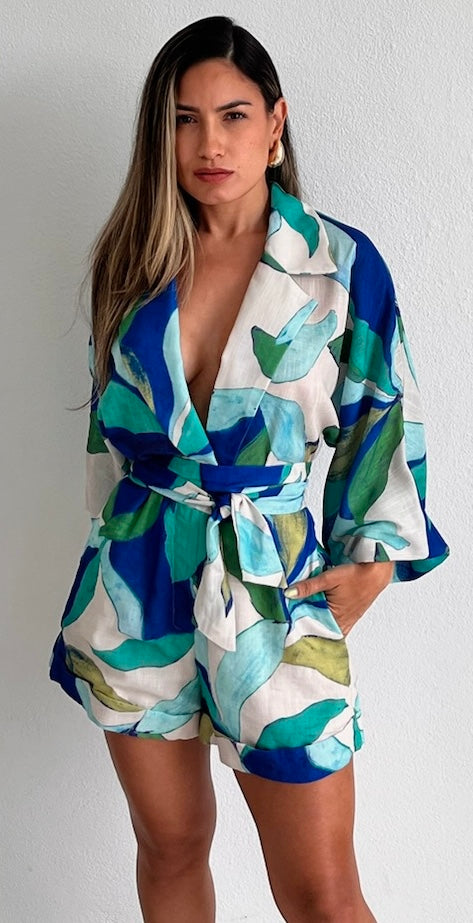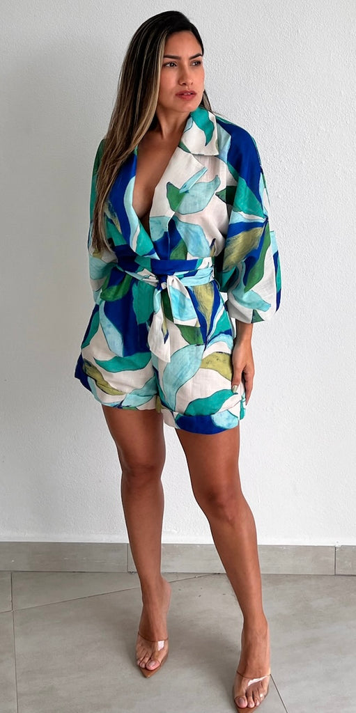 featuring Long Sleeves V-Neck Blazer Top Romper with Pockets in a Linen Abstract Fabric.
