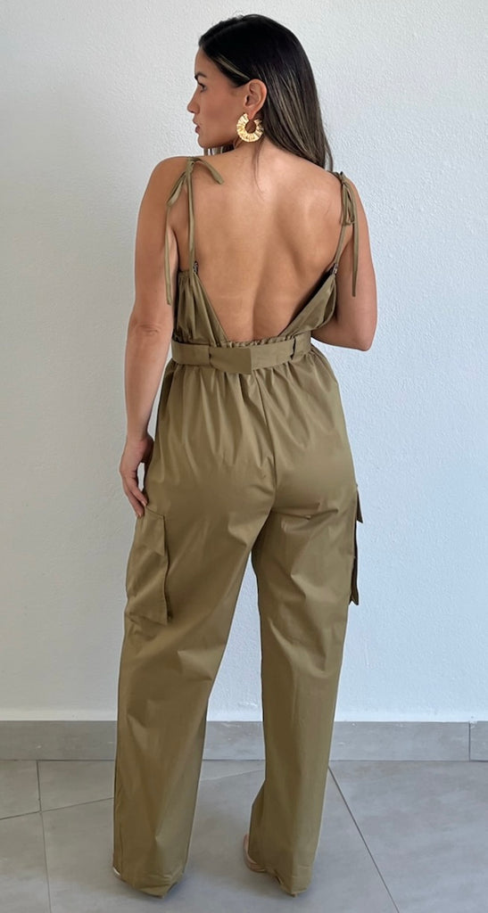 featuring V-Neck Top with Open Back and Adjustable Spaghetti Straps. Fitted at the Waist with Same Fabric Belt and Cargo Comfy Pants with Pockets in a Soft Fabric.