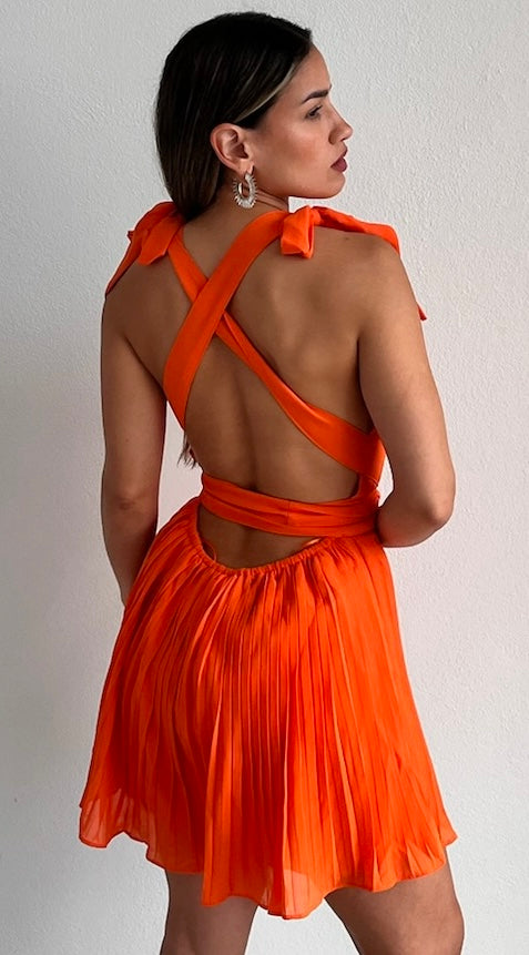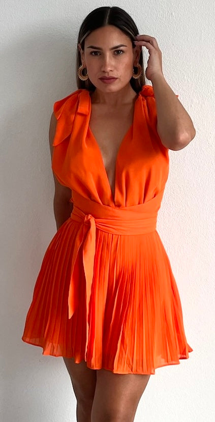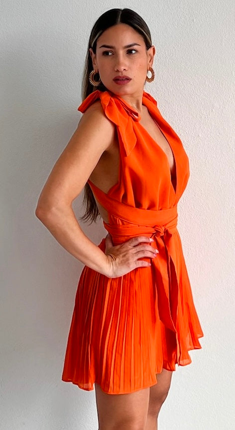 featuring V-Neck Halter Top, Crossed at the Back with Flare Pleated Shorts in a Orange Chiffon Fabric.