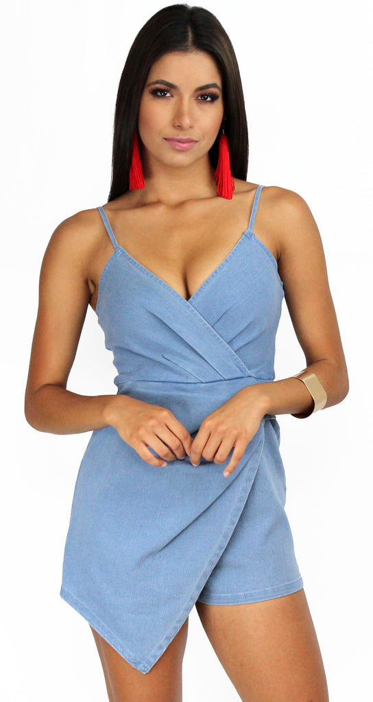 featuring V-Neck Top and Over Layer Asymmetrical Skirt and Inside Shorts in a Light Denim Fabric.