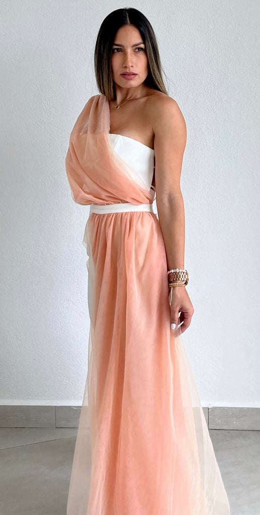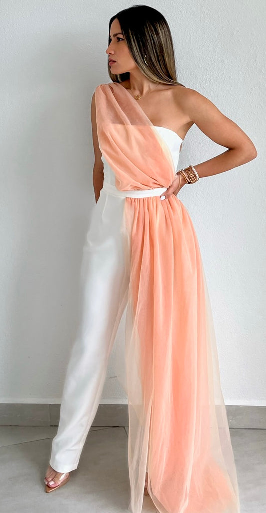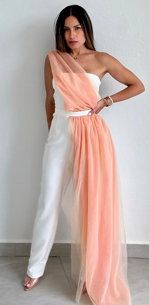 featuring One-Shoulder Top in Peach Mesh goin down and Crossing at the Other Side of the Waist and Keep going down to the Bottom of the Pants. Open Spaghetti Straps Back, Fitted at the Waist and Skinny Pants in a Waist Soft Fabric
