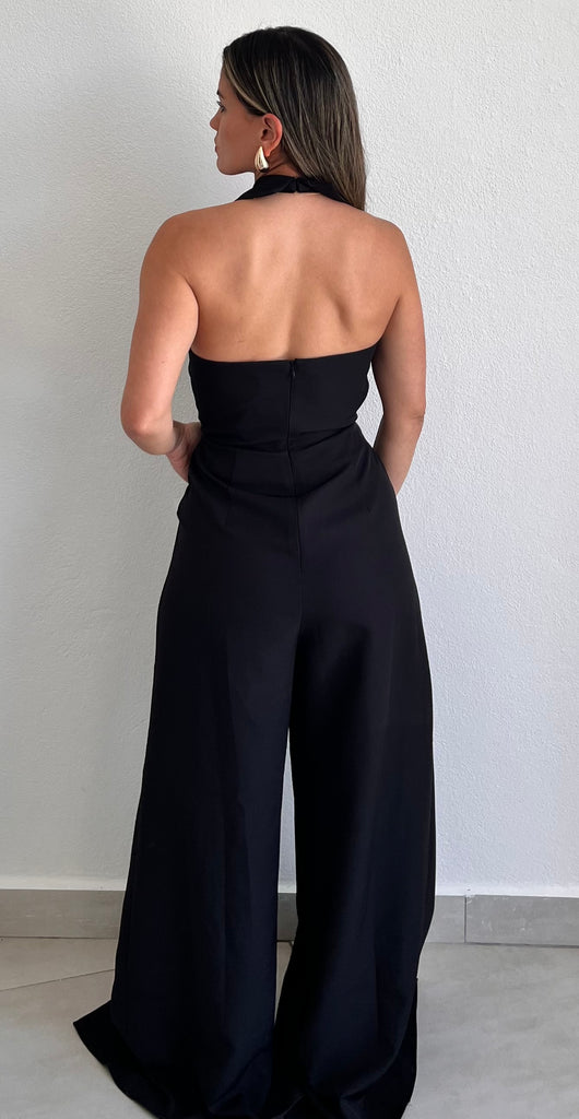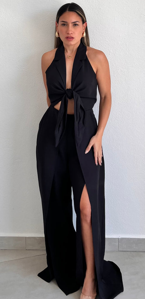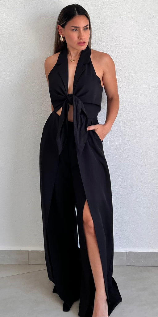 featuring Blazer V-Neck Top with Knot, Fitted at the Waist and Flare Open Slit Pants with Pockets in a Black Fabric.