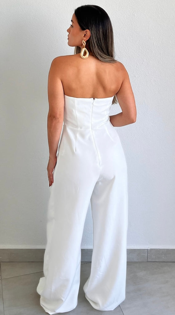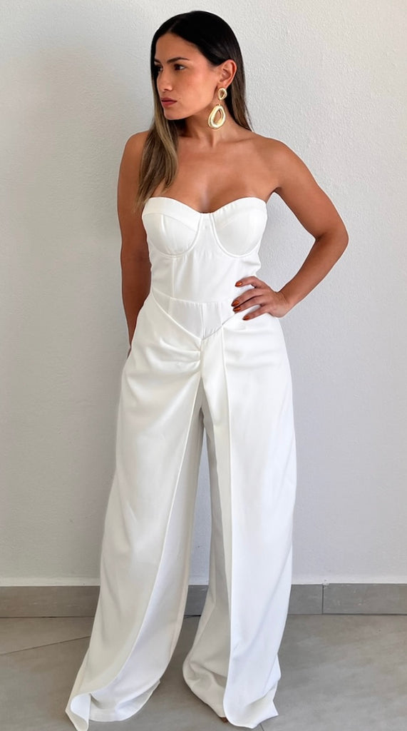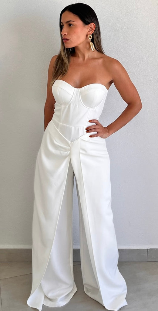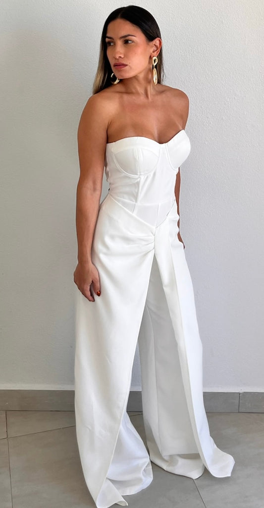 featuring Strapless Corset Top, Fitted at the Waist and Flare Pants with Open Front Slits in a White Fabric.