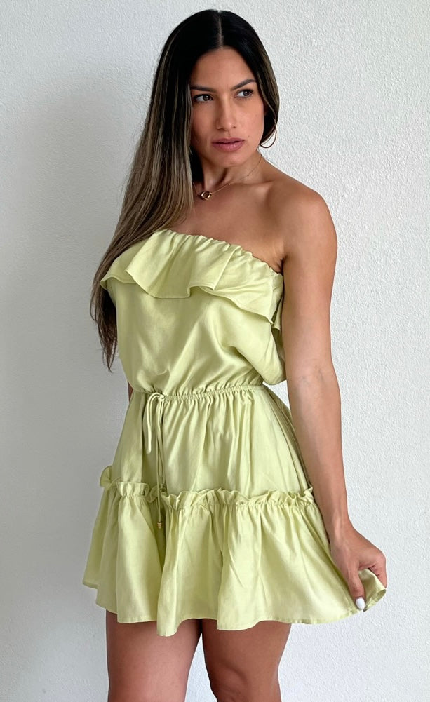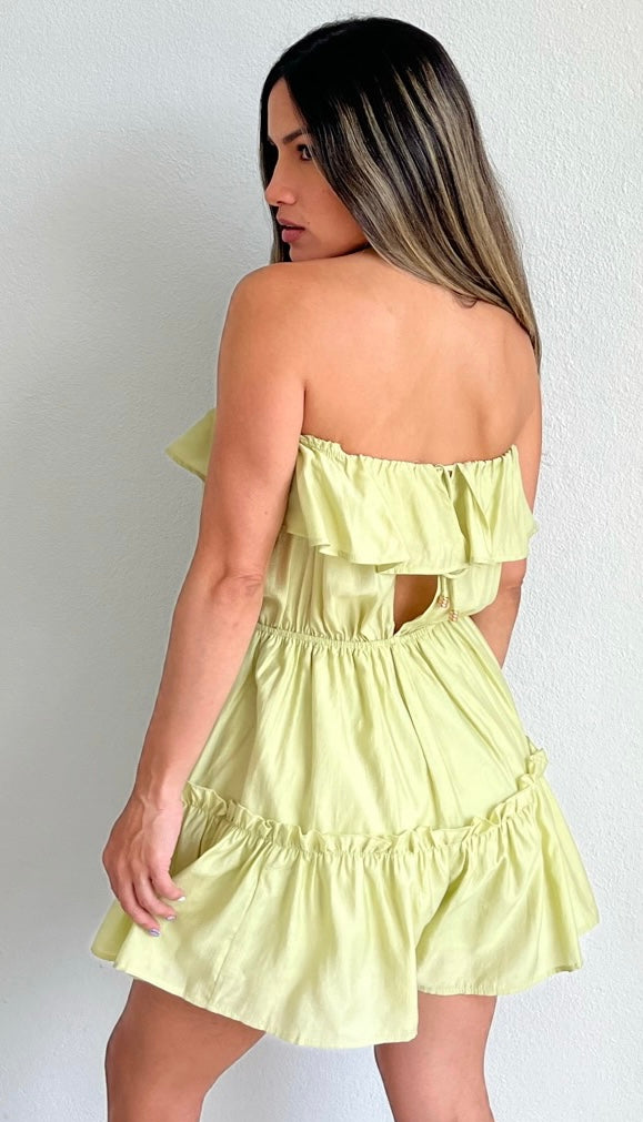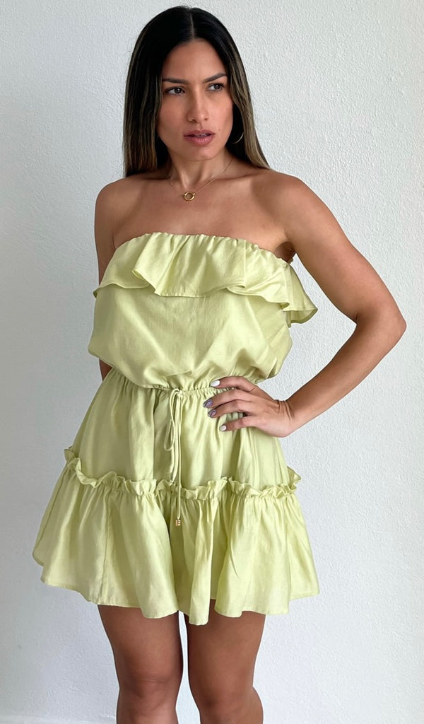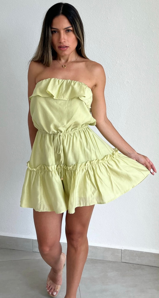 featuring Strapless Top with Ruffled Detail, Fitted at the Waist and Flare Shorts in a Light Fresh Lime Fabric.