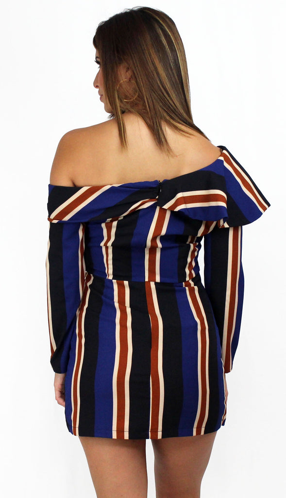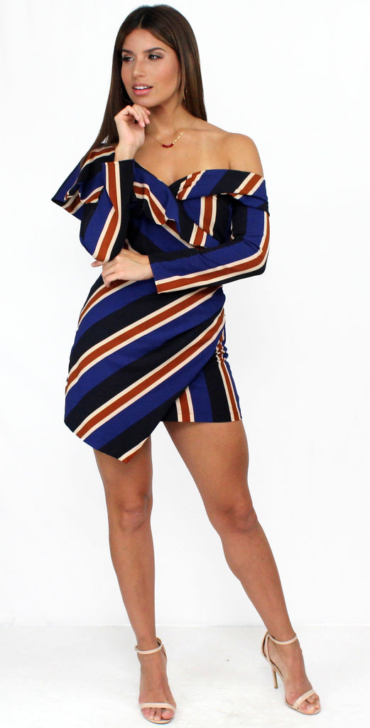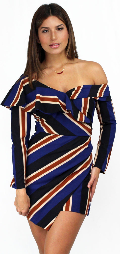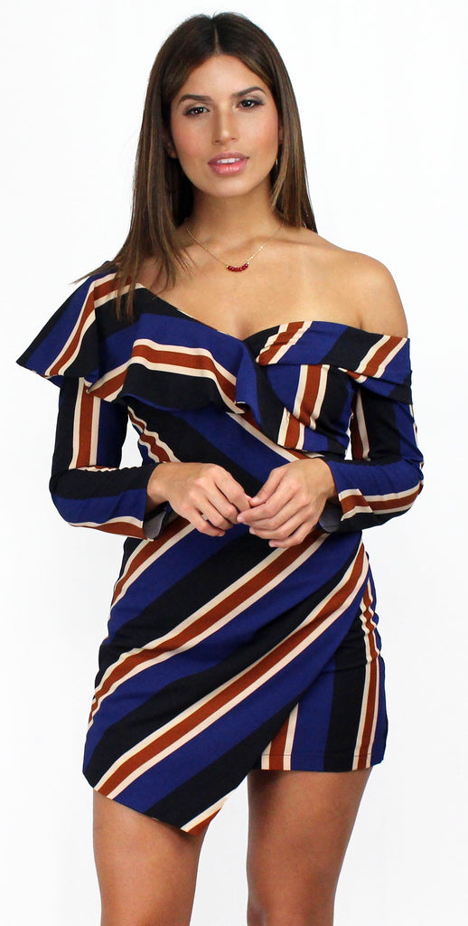 featuring One-Shoulder with Ruffle Detail and Long Sleeve Top & Layered Asymmetrical Mini Skirt in a Stripes Fabric
