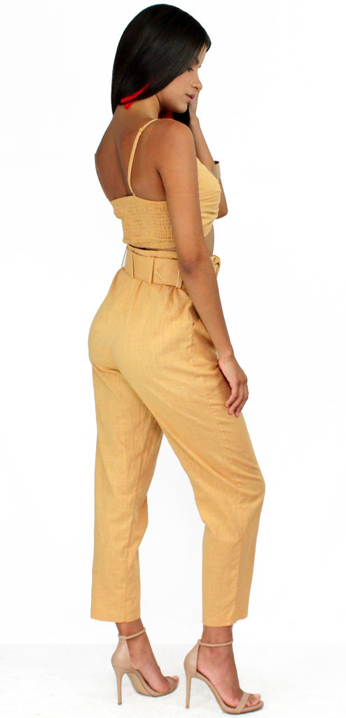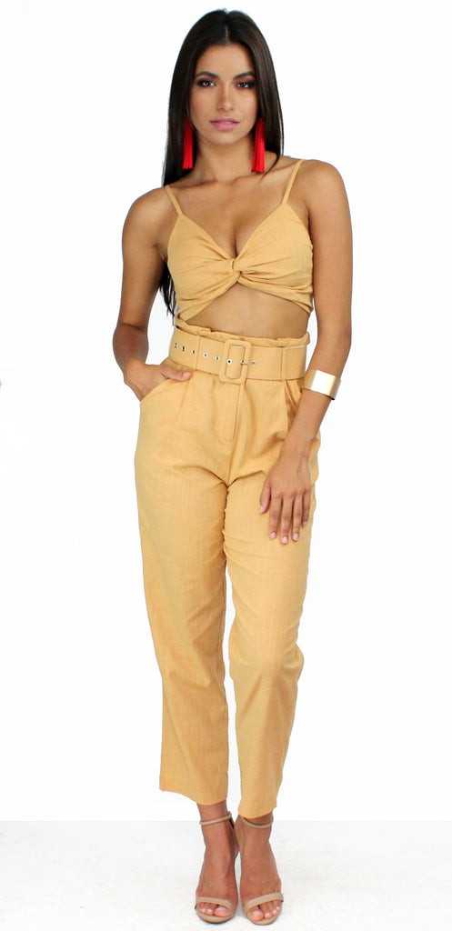 featuring Spaghetti Straps Twisted Front Crop Top with High Waist Skinny Pants with Bold Belt at the Waist in a Caramel Cotton Light Fabric.