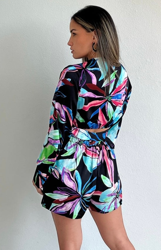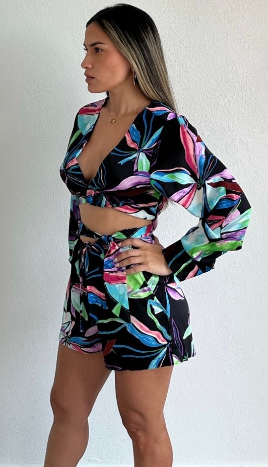 featuring V-Neck Long Sleeves Top Adjustable at the Waist and High Waist Shorts with Pockets in a Satin Print Fabric.