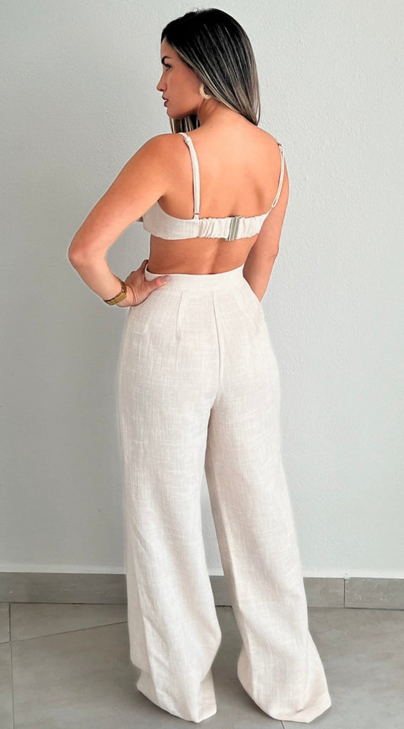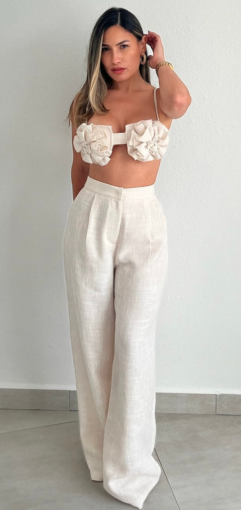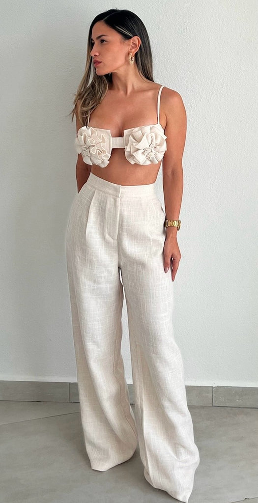 featuring Bra Top with Flower Fabric at the Brest and High Waist Flare Linen Pants.